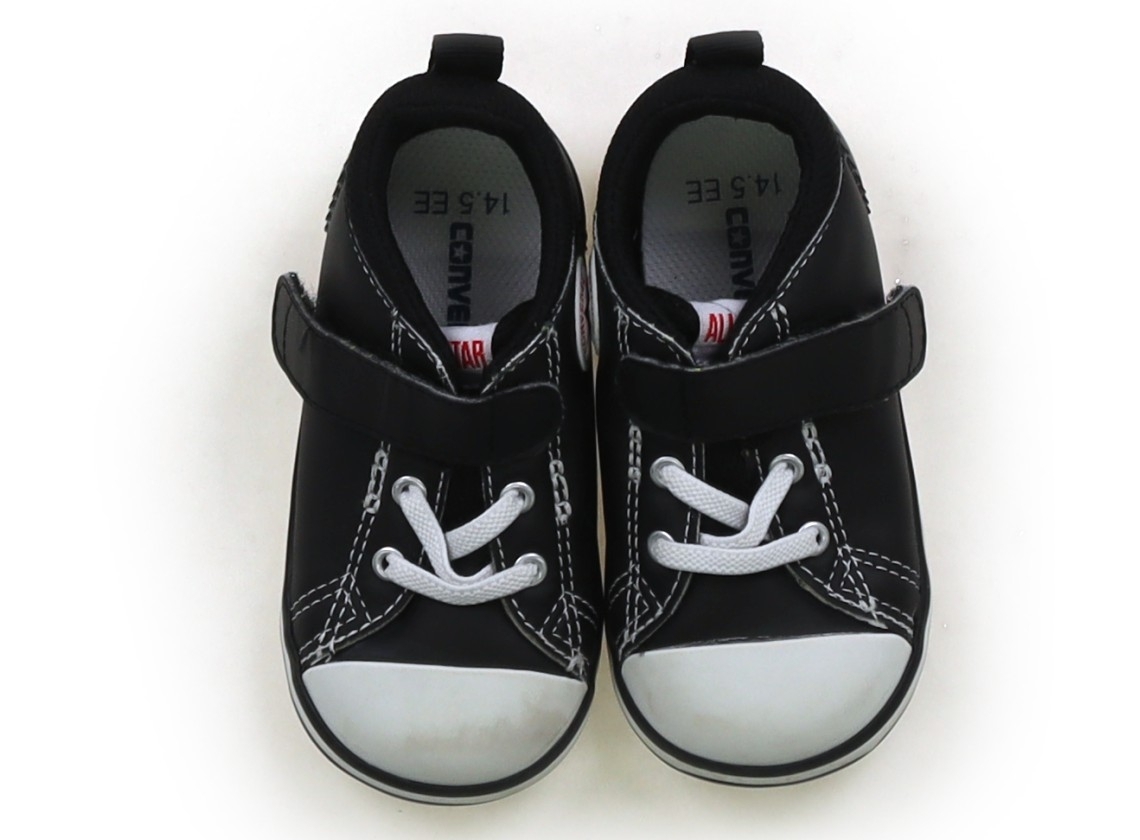 実際のサイズ表記は14.5cm。黒地部分はマットな質感です。つま先に茶色い汚れがあり、ソールにやや底減りがあります。まだまだ普段着として活躍してくれそうです。