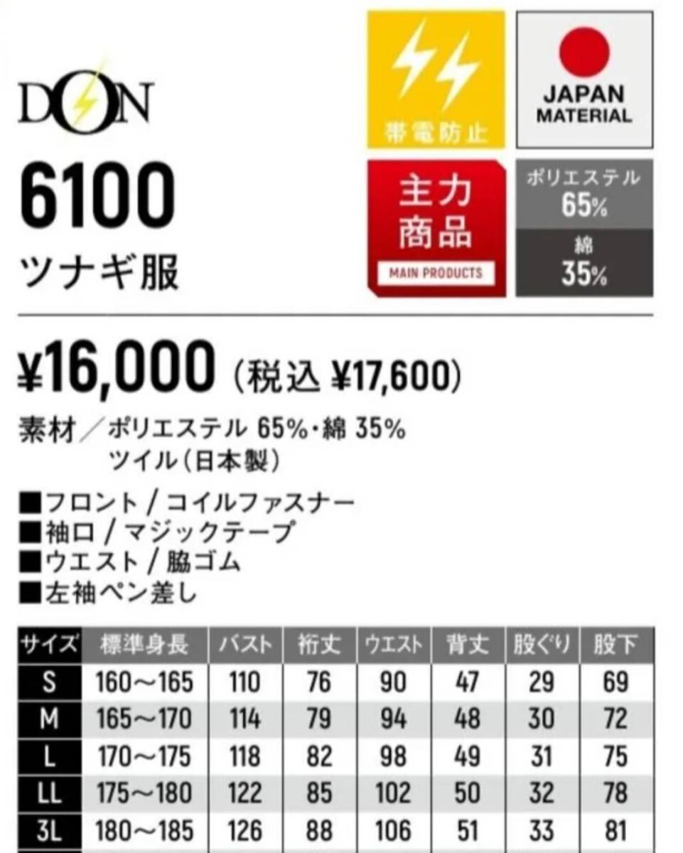 4125 ツナギ服|ヤマタカ|DON 6100|ブラック|LLサイズ|長袖|新品未使用|帯電防止|胸ファスナー|綿ポリ混紡|B体|つなぎ|整備服|作業着|黒
