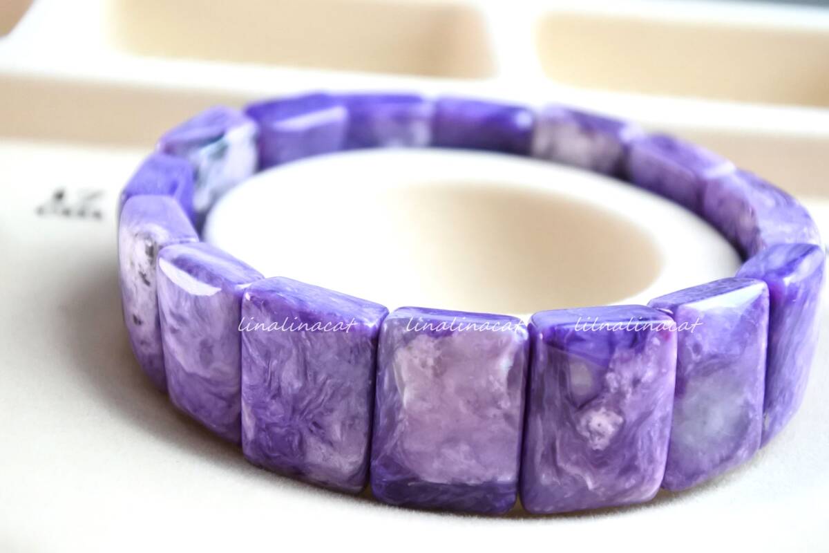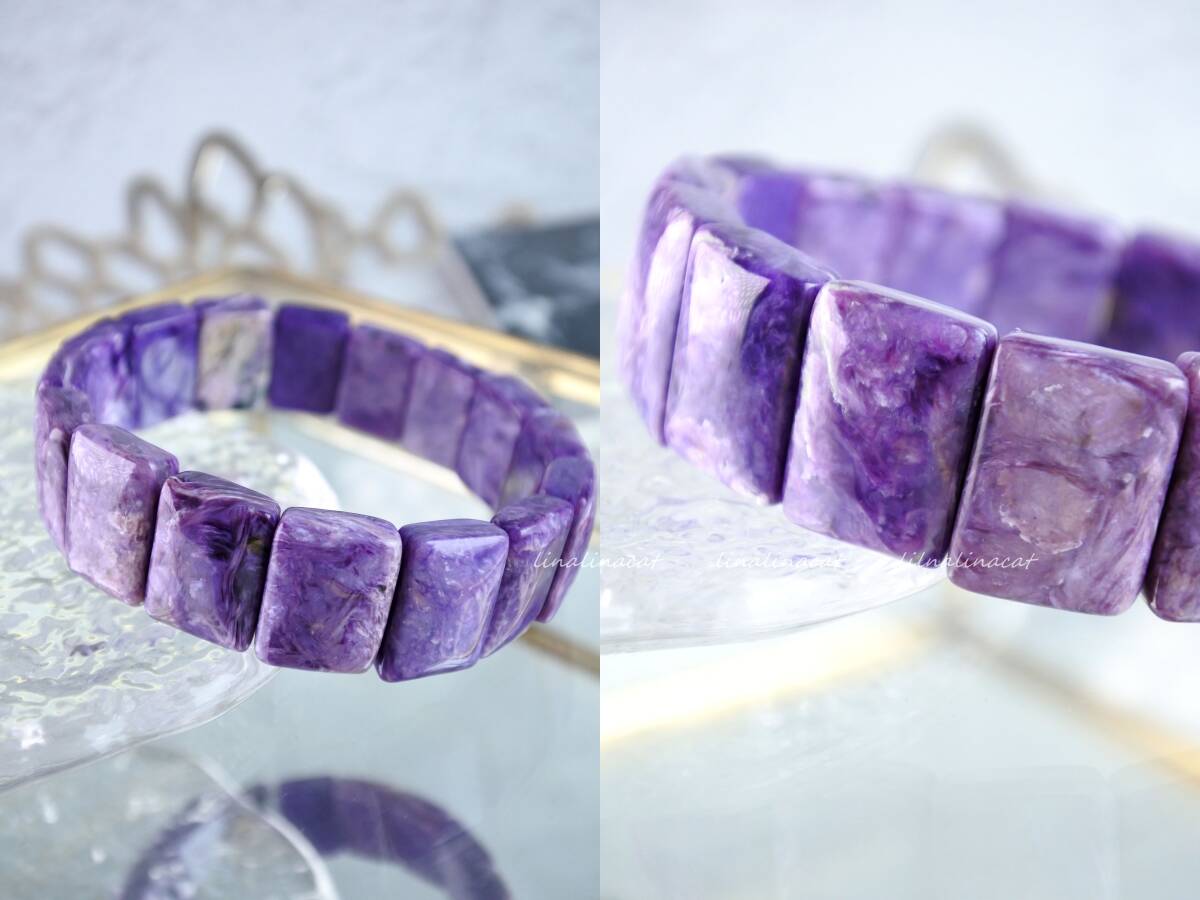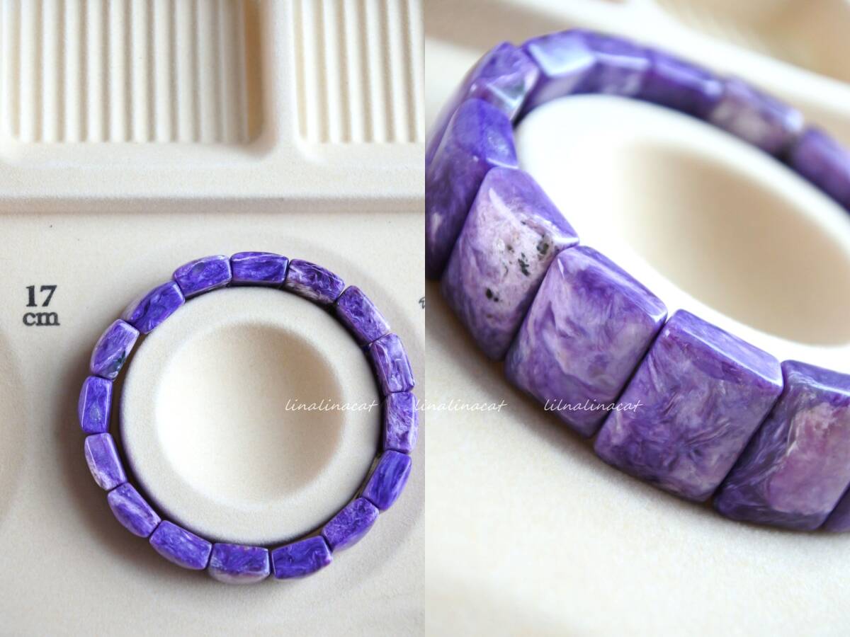 ミネラルショーや天然石専門店などで購入したコレクションを多数出品中です。 試着したものもございますが基本的にアクセサリーは身に着けないため未使用のコレクションとなります。 天然石のためインクルージョンやクラック、欠けなどあるものもあるかと思いますが「気の良い子」ばかり集めていましたのでその子の個性と歴史として気に入ってくださった方にお譲りできれば幸いです。 日常のちょっとしたおしゃれに。 ささやかなお守りとして。 お気に入りを見つけられますように。 ********************** 天然石ブレスレット ② AAA チャロアイト バングル パワーストーン ヒーリング 癒し 浄化 ストレス 17.5㎝ 17㎜×12㎜(1ピースの大きさ) バングルタイプで少し大き目のサイズとなっておりますので、男性、女性ともにお勧めのお品です。 チャロアイト特有のとろけるような美しい紫のマーブル模様が堪能できます。 稀にシリカも混ざっており、紫の部分とシリカの透明感のある部分が何とも言えず絶妙な美しさを醸し出しています。 気高い天使のオーラの様な癒しを感じていただけると思います。 「チャロアイト」は、「スギライト」や「ラリマー」と同じく、世界三大ヒーリングストーンの一つに数えられる石です。油彩画のような質感を持つ芸術的な印象を持つ石で、この不思議な模様は、黒色:エジリン(Aegirine錐輝石)、帯状の灰色:マイクロクリン(Microcline微斜長石)、白色:カリ長石(PotassiumFeldspar)、黄緑色:カナサイト(Canasite)、淡黄色:ティクナクサイト(Tinaksite)などの鉱物が、マーブル状に混ざりあうことから成り立っています。薄紫色の彩色は不純物のマンガンに起因します。 チャロアイトという名前の由来には、シベリアのチャロ川流域で発見された事とする説と、ロシア語の(Charo魅惑)から名づけられたという説がありますが、後者の方が有力であるとされています。その名の通り、この石の個性的な模様は、見る人を魅了してやみません。まさに、「魅惑の宝石」にぴったりな石です。 クロゼット整理のため他にも出品中です。 おまとめ取引も大歓迎ですのでお気軽にお声がけください。 | ||