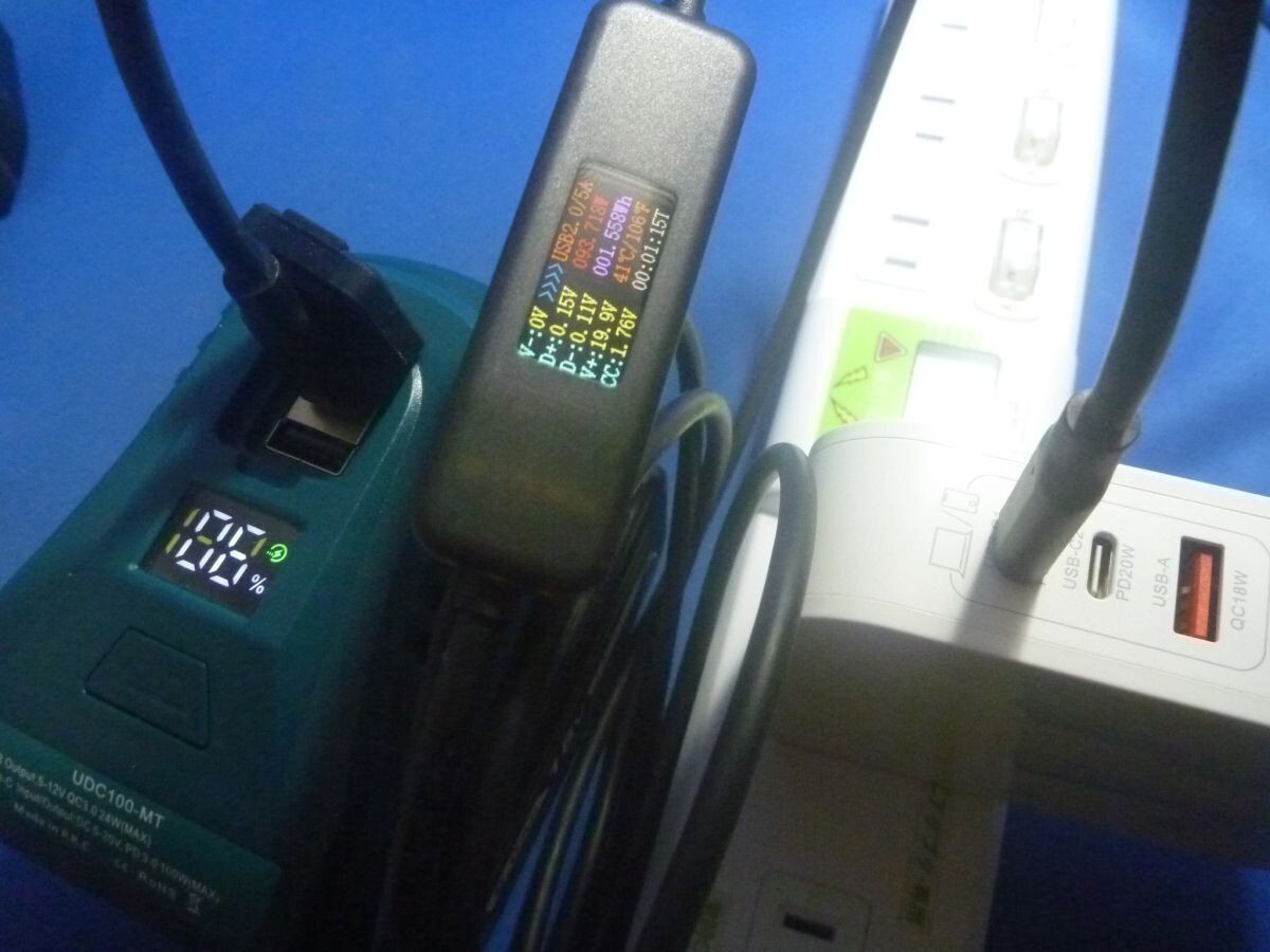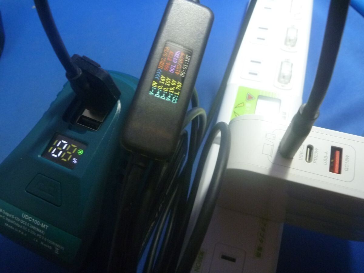 | 商品説明 | 2ポート USB-C PD 3.0 100W と USB-A 入力 バッテリー: 18v(マキタ、牧田互換用) USBタイプC: 5-15V/3Aまたは20v/3.25A・・・・・・充電用 出力 USBタイプA:5V/3A USBタイプC: 5-15V/Aまたは20V/A (最大100w) makita(マキタ互換)バッテリーからTYPE-Cにて100W の高速充電が可能です。 (対応機器で対応ケーブルを使用の場合) 写真の例ではノートパソコンの充電中 makita(マキタ互換)バッテリーをTYPE-Cにて100Wの高速充電が可能です。 (TYPE-Cケーブル、ACアダプタは高速充電対応のものをお使いください。) 写真の例ではACコンセントからアダプタを経由してTYPE-Cでマキタ電池を充電 保護回路: 過放電電圧13.5-14v保護、短絡保護。 対応バッテリー マキタ18Vリチウムイオンバッテリー用: BL1815 BL1830 BL1840 BL1850 BL1850B BL1860 BL1860B BL1890などマキタバッテリーや互換品バッテリーに対応しています。 ーーーーーーーーーーーーーーーーーーーーーーーーーーーーーーーーーーー 写真の動作例の充電、放電の詳細が分かる液晶搭載ケーブルは別途出品しています。 ーーーーーーーーーーーーーーーーーーーーーーーーーーーーーーーーーー 充電時高性能を発揮するには、100w以上の電源アダプターを使用してください。 条件を満たしていないと、充電が遅くなります。 TYPE-Cは入力としてだけでなく出力としても使用できます、USB・A端子は出力としてのみ使用できます。 画面の数字はバッテリー容量を表しています。 バッテリーが全容量なら100% と表示されます。 18vバッテリーのみ充電できます。 2ポートあるため、2系統の機器を同時充電が可能です。 この電源アダプターは、マキタ18Vバッテリーを充電するための充電器としても使用できます。 そのためマキタの重たい充電器を持ち運ぶ必要がなく、便利です 充電ポートを埃や水から守るラバーカバーを装備 新品即納です。 使用例の写真のマキタバッテリー、pc等は付属しません。 こちらはマキタの製品ではございません。 マキタ互換バッテリーは別途ご用意ください。 大量コネクタ付属で電圧可変ケーブル追加の特別セットも別途出品しています。 あわせてご検討ください。 |