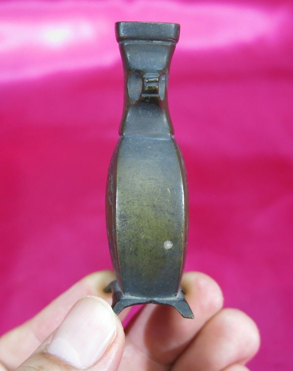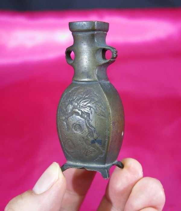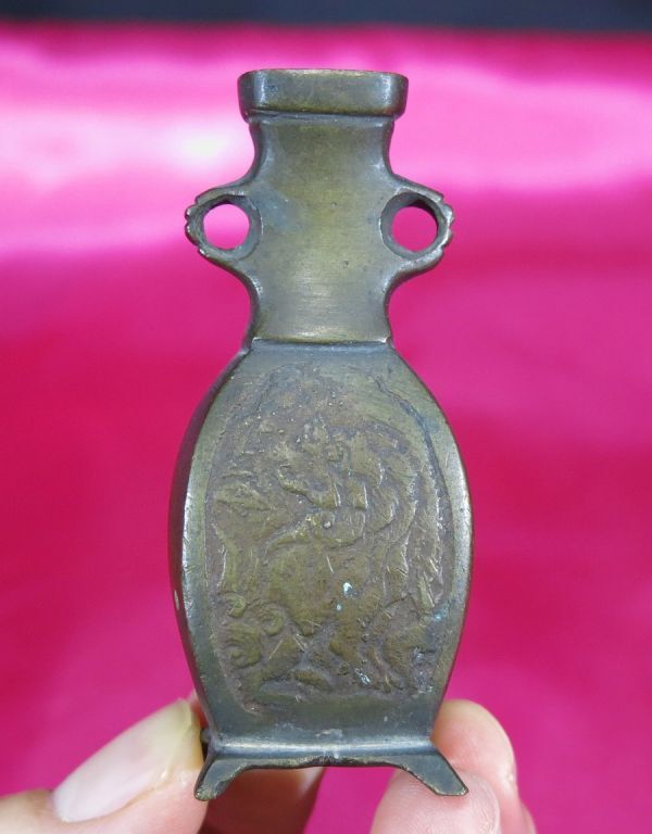 古銅獅子図双耳脚付花瓶 清時代 中国 金工 です。       コレクション整理での 出品です。