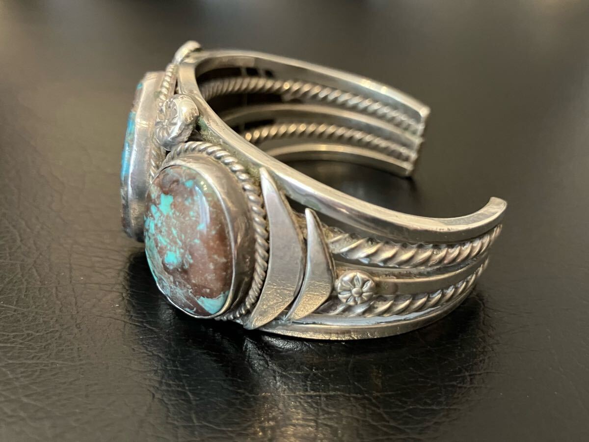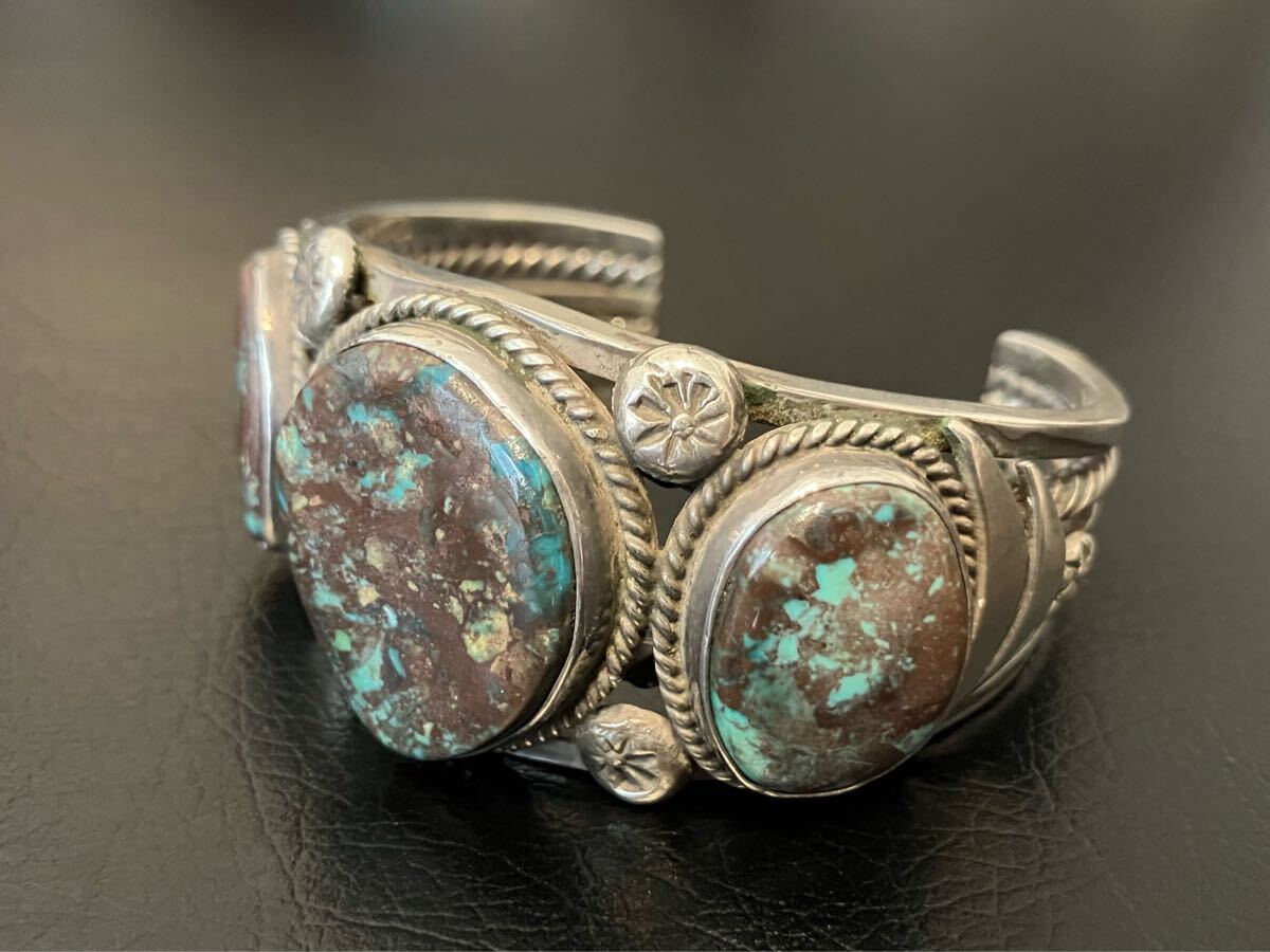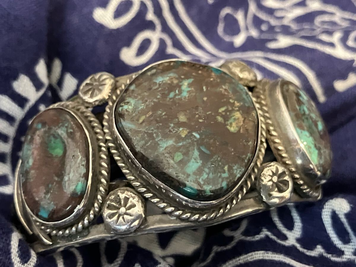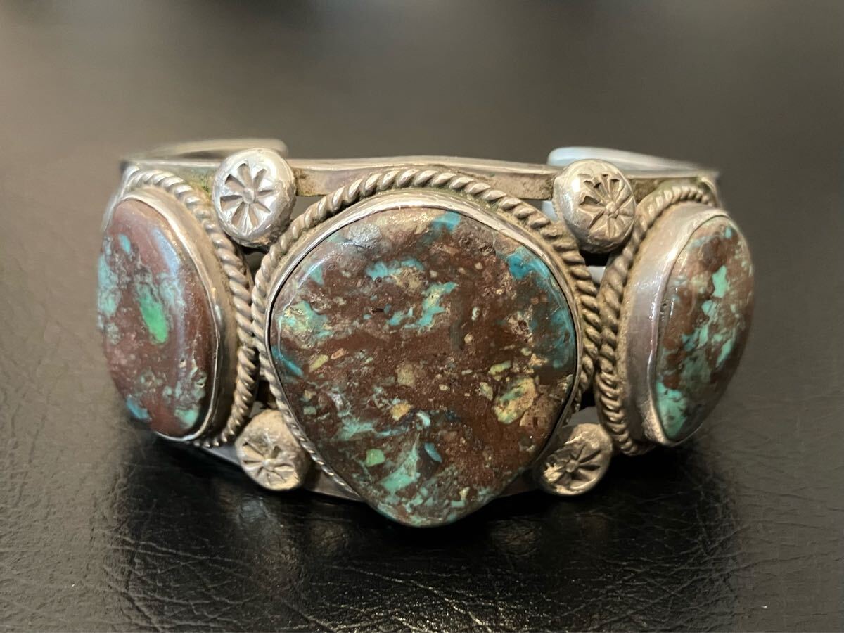 OLDPAWNならではの大ぶりのビズビーを3つ使用した3連ターコイズ バングルです。