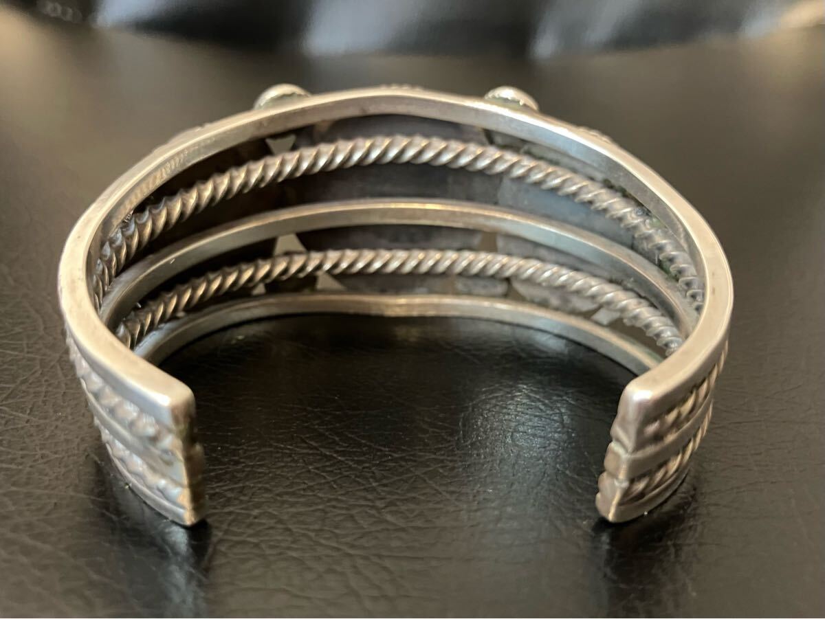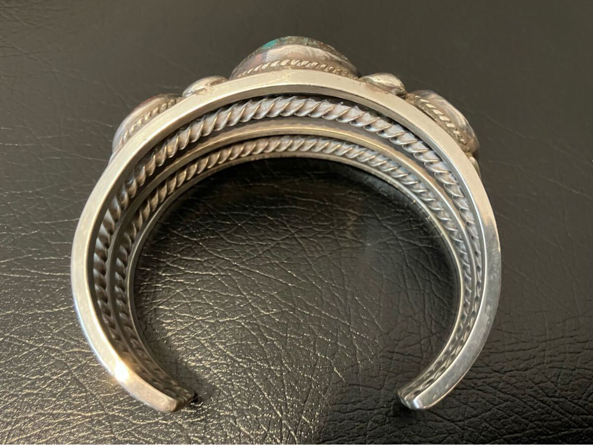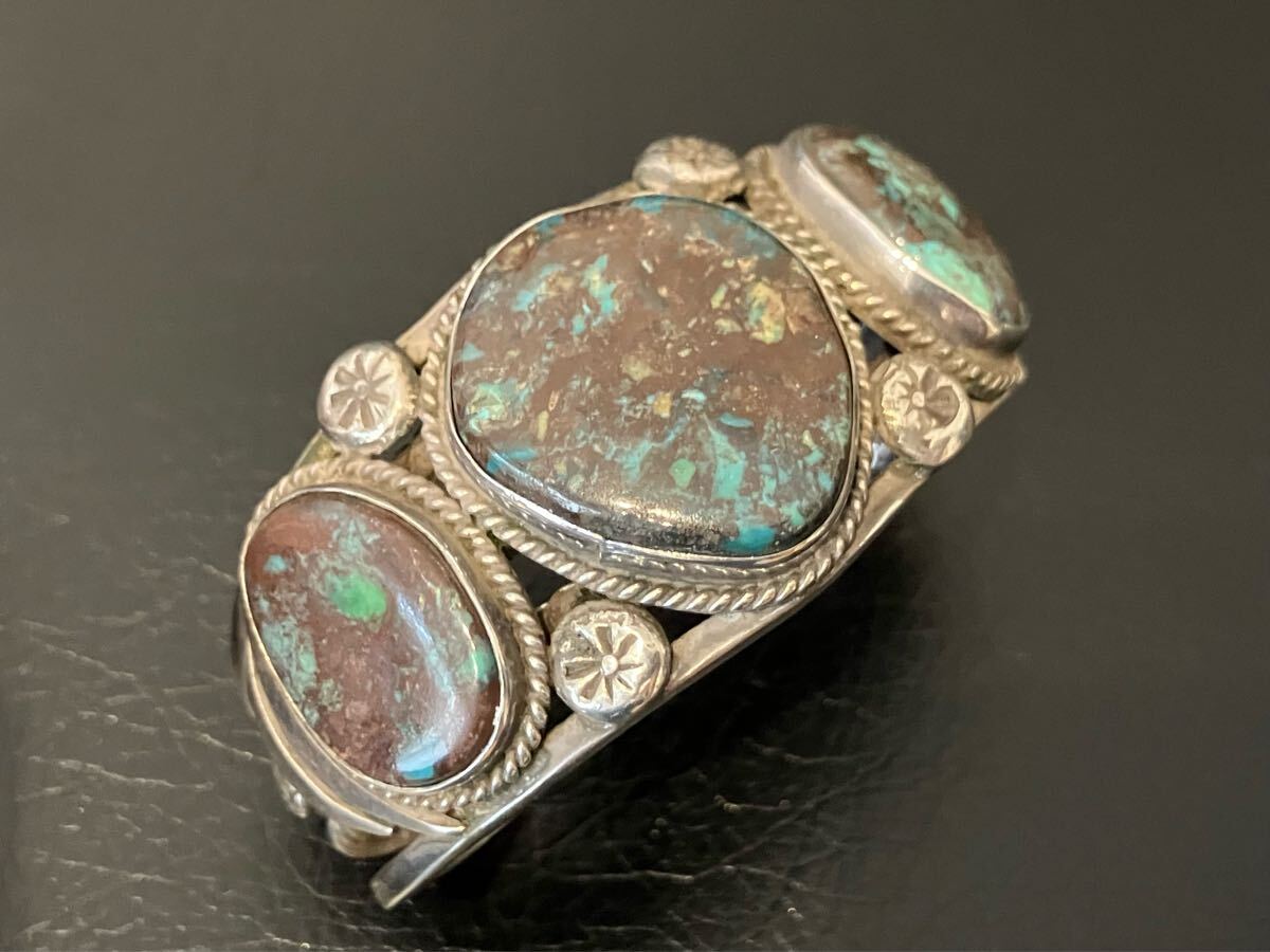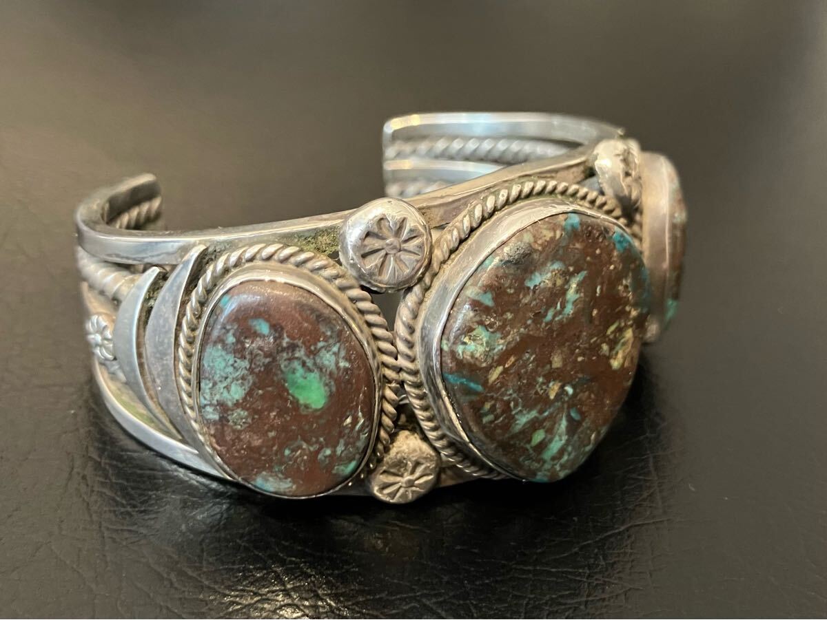 OLDPAWNならではの大ぶりのビズビーを3つ使用した3連ターコイズ バングルです。