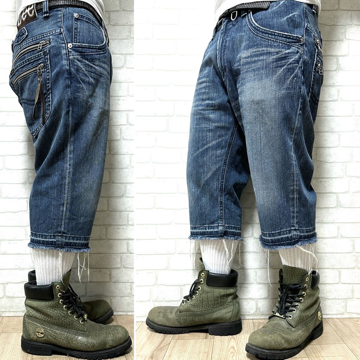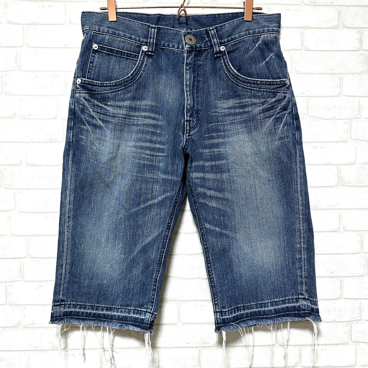 ☆カットオフデザインを施した手の込んだ作りのデニムショーツ。全体にはウォッシュ加工を施し、味のあるルックスに。更にバックには二重構造のポケットやシンチバック、牛革ハラコパッチを配置した豪華なディテールが魅力のアイテムです。