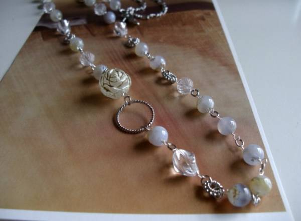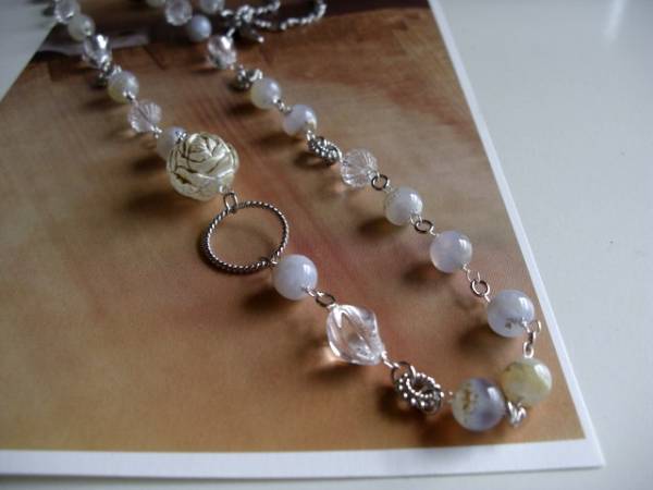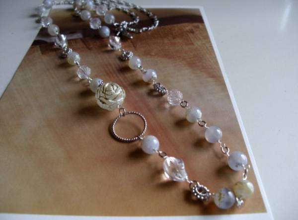 やさしい春色・・シリーズです♪アンニュイな薔薇・・神秘的なブルーレースと水晶のネックレスです♪樹脂の薔薇やチェコビーズやデザインリングを合わせてロマンチックしています♪ブルーレースは8ミリの丸玉、水晶は13×8ミリ位のナツメカットです♪長さは全長95センチ位で調節自由です♪2連にされても素敵です♪お揃いのブレスレットも出品しています♪シンプルで飽きのこないいつまでも着けられるデザインを考えて作りました!ハンドメイドをご理解頂いてノークレーム、ノーリターンでお願いします