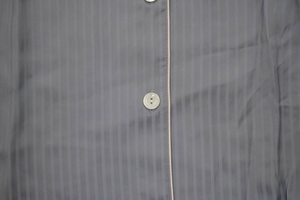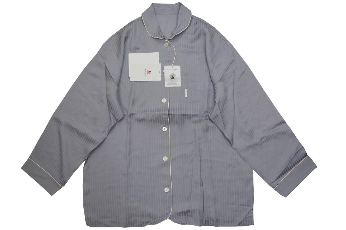 素材はキュプラ100%。前開き、長袖、ロングパンツ。サイズはLでバスト86-94㎝。 色はシルバーグレーです。定価税込み¥22000です。