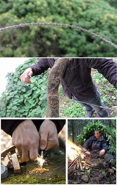 ・ワイヤーソーで木の枝を切り出し、ファイヤースターターをこすって着火!