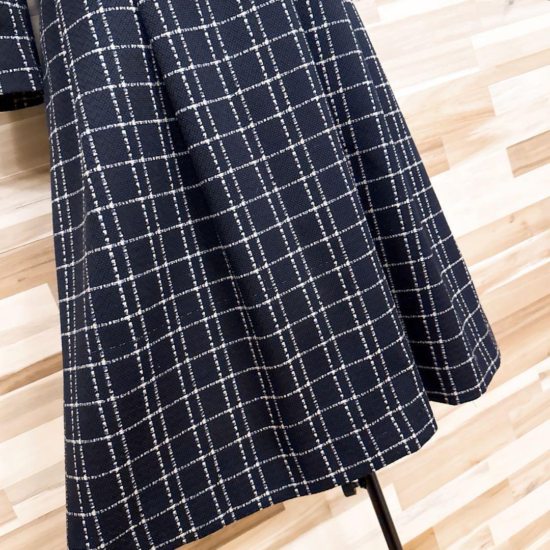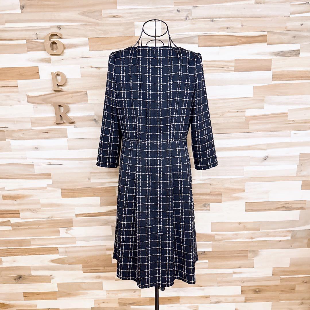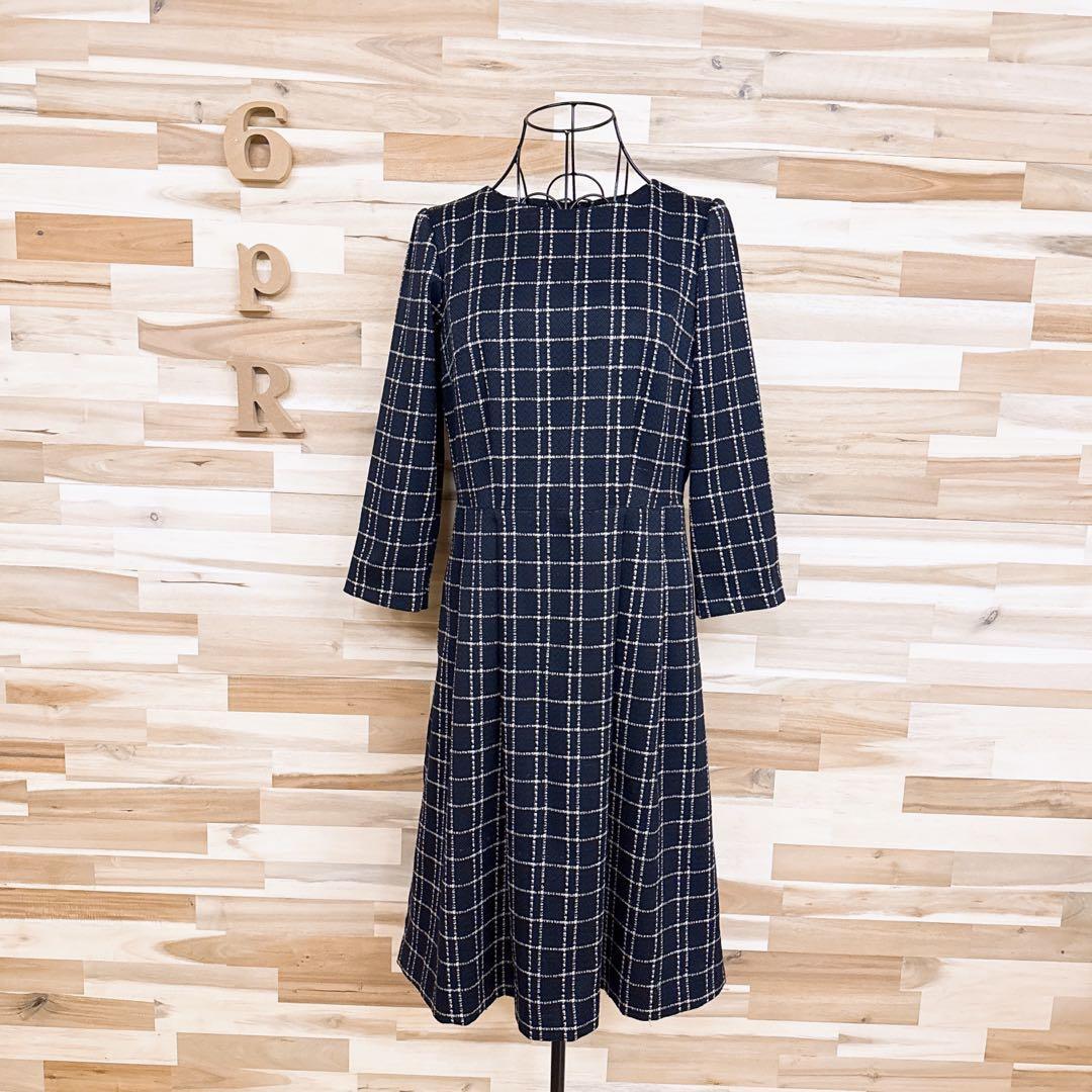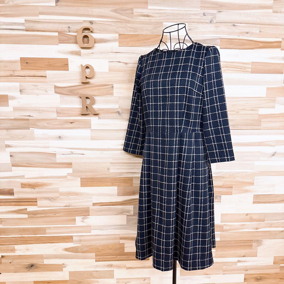 凹凸のある表面がほどよい厚みと立体感を生み、軽くしなやかな手触りが心地よい生地感。深みのあるネイビーベースに、アイボリーのラインが整然と並ぶチェック柄。ウエストの切り替えとフレアのシルエットが女性らしい輪郭を描き、ミニマルなデザインが上品さを引き立ててくれる一着。パンプスを合わせれば知的でクラシカルな装いに、ブーツで少しラフにまとめても素敵なMACKINTOSH PHILOSOPHYのワンピースです。※LGスタイラーにて除菌リフレッシュ・スチームクリーニング済みです。