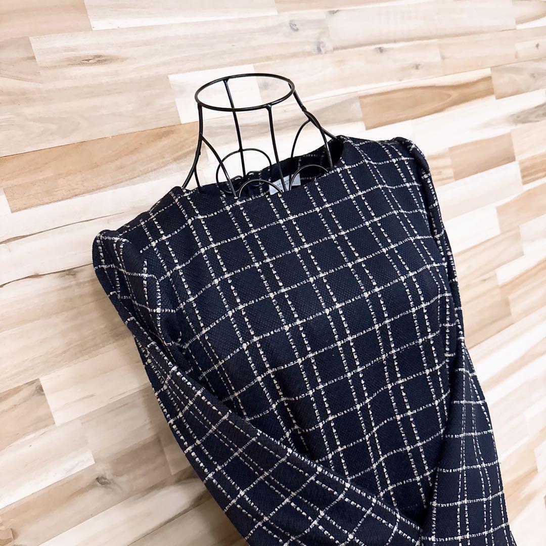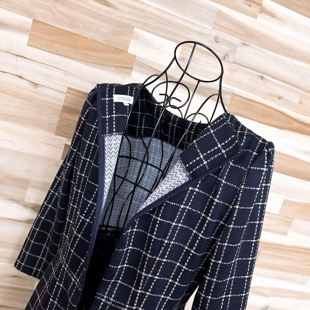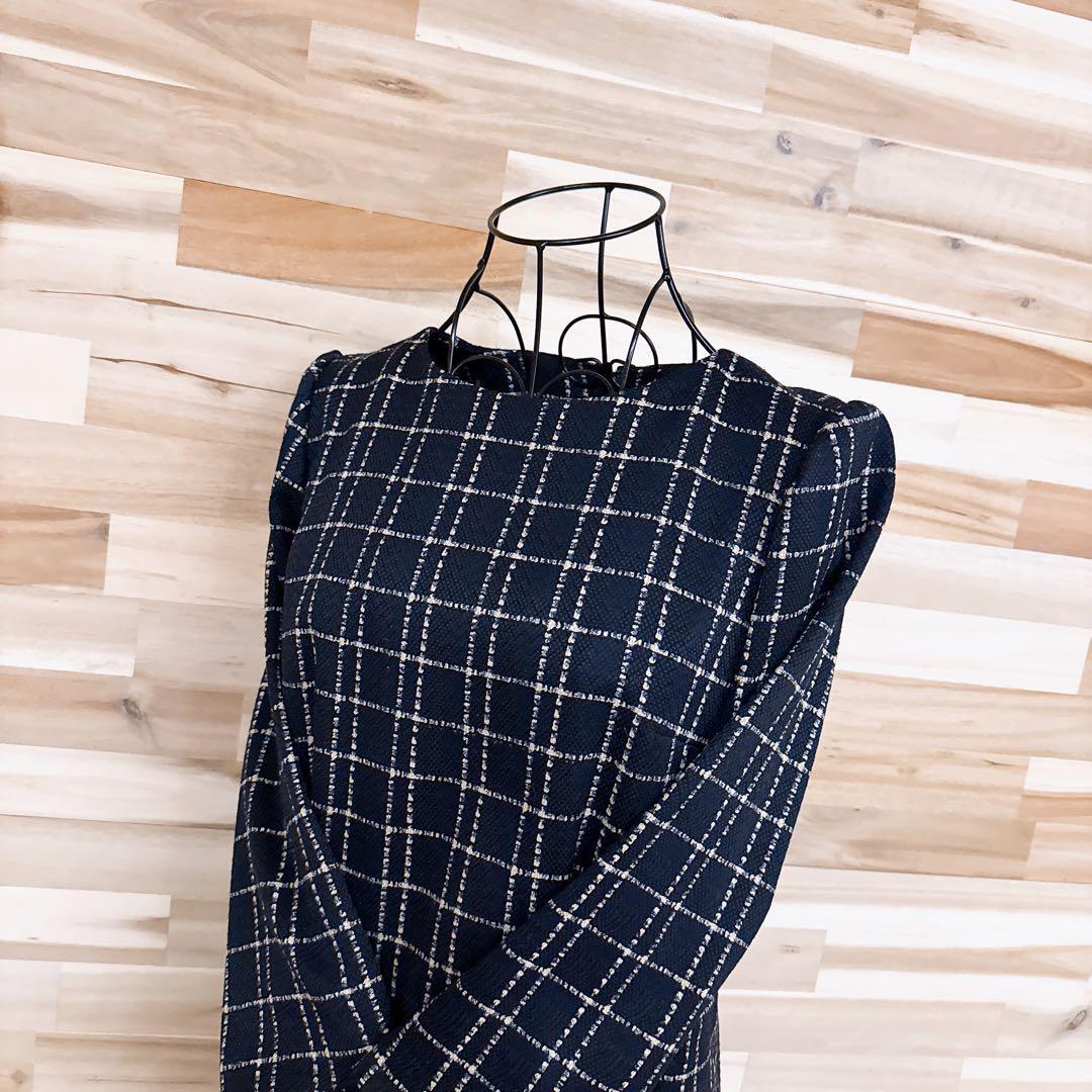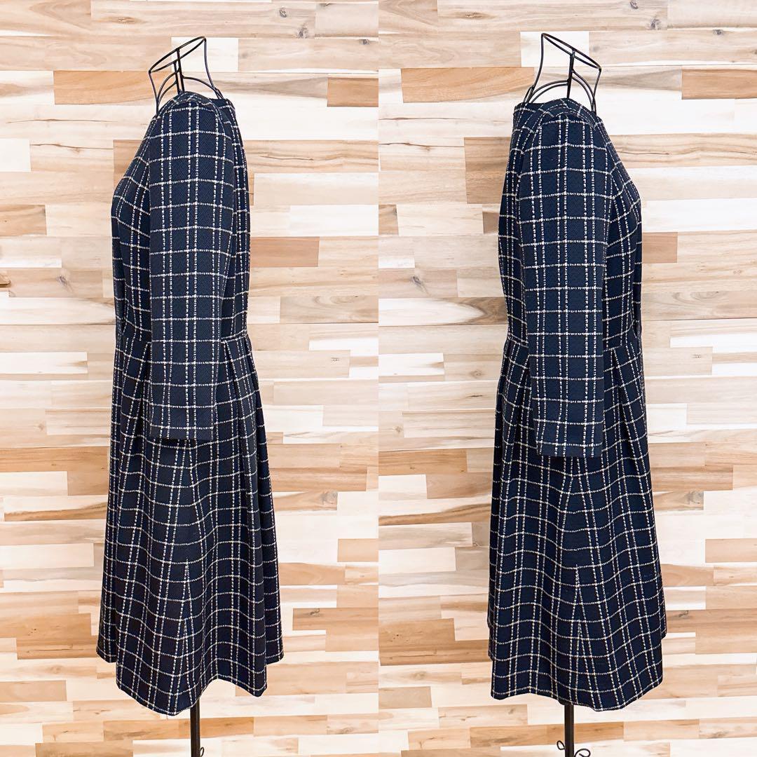 凹凸のある表面がほどよい厚みと立体感を生み、軽くしなやかな手触りが心地よい生地感。深みのあるネイビーベースに、アイボリーのラインが整然と並ぶチェック柄。ウエストの切り替えとフレアのシルエットが女性らしい輪郭を描き、ミニマルなデザインが上品さを引き立ててくれる一着。パンプスを合わせれば知的でクラシカルな装いに、ブーツで少しラフにまとめても素敵なMACKINTOSH PHILOSOPHYのワンピースです。※LGスタイラーにて除菌リフレッシュ・スチームクリーニング済みです。