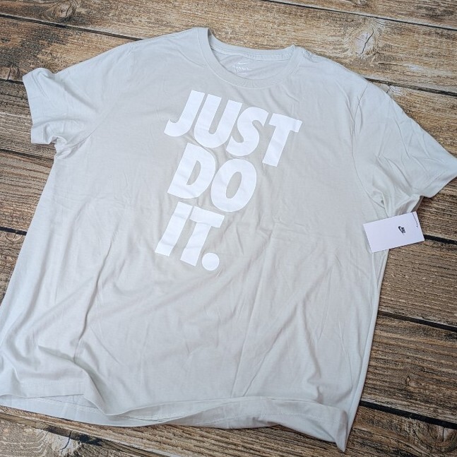 ナイキ“JUST DO IT”ロゴのグラフィックTシャツです。ドデカブロック体のデザインは日本ではなかなか見ないと思います。薄いグレーカラーにインパクトのあるホワイト文字は1枚で着るのも良し、シャツと合わせるのもgoodです。
