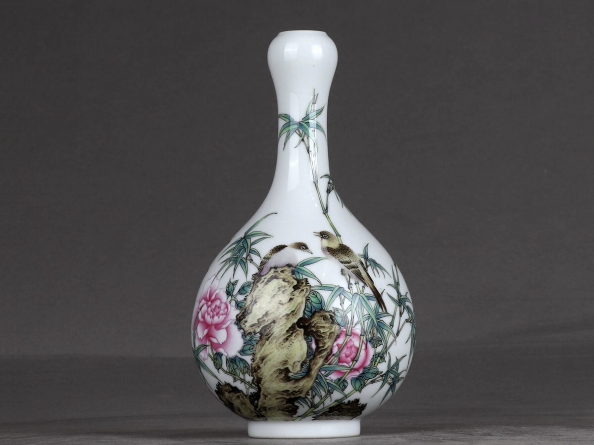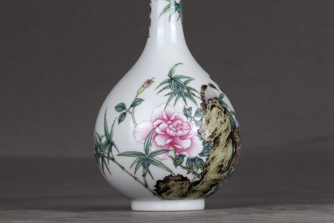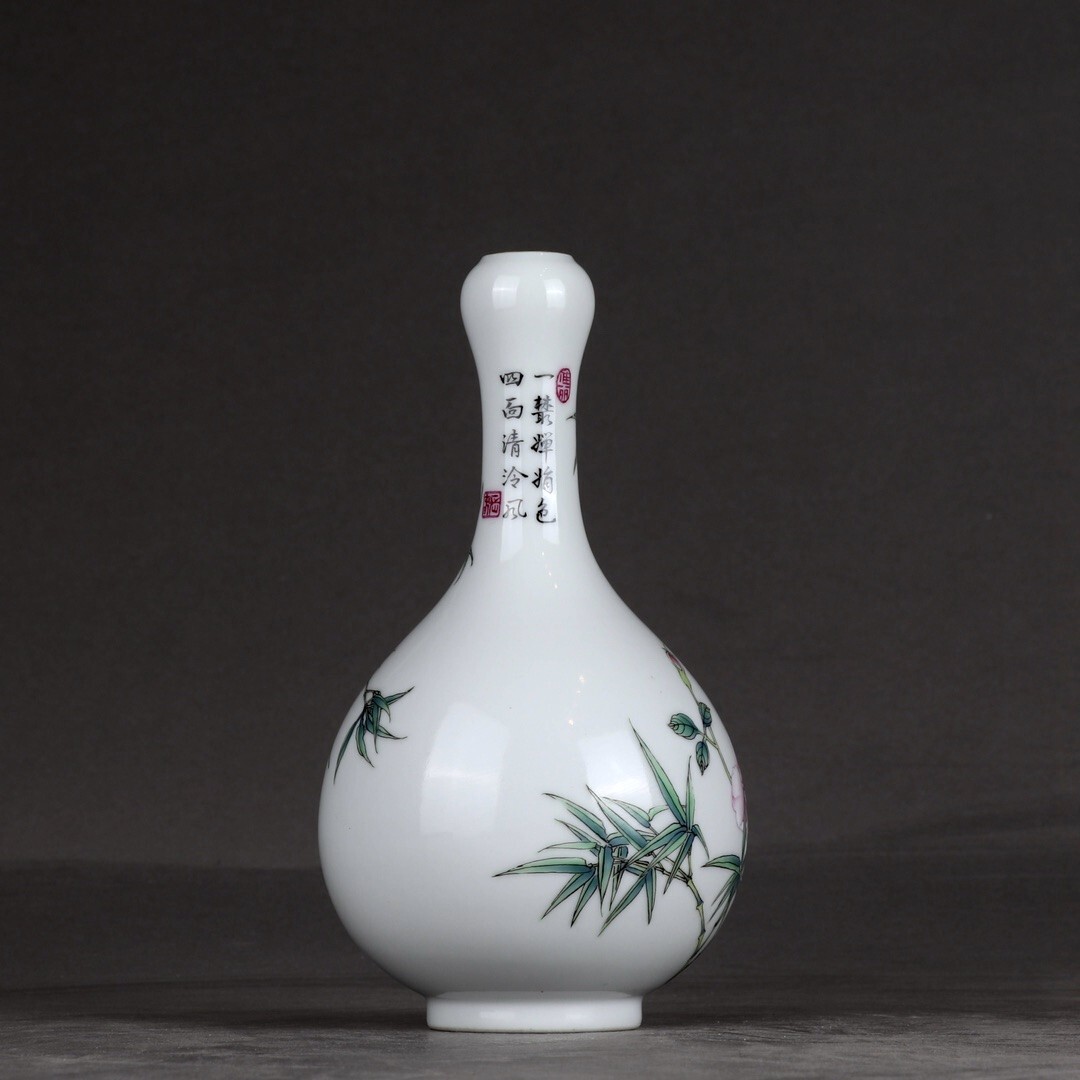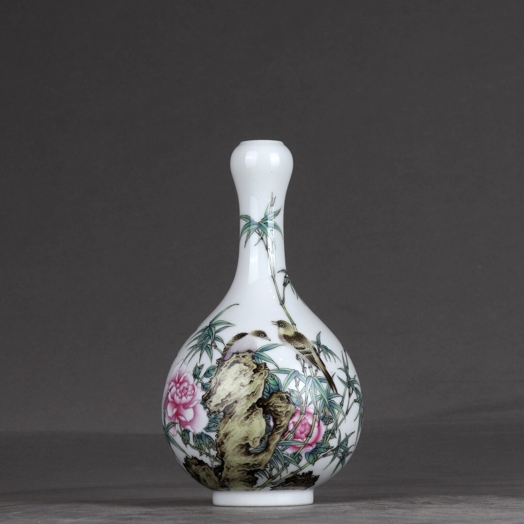 「清 乾隆年製 陶磁器 琺瑯彩花鳥紋 題詩蒜頭瓶」染付 置物 擺件 古賞物 中国古美術 旧蔵出