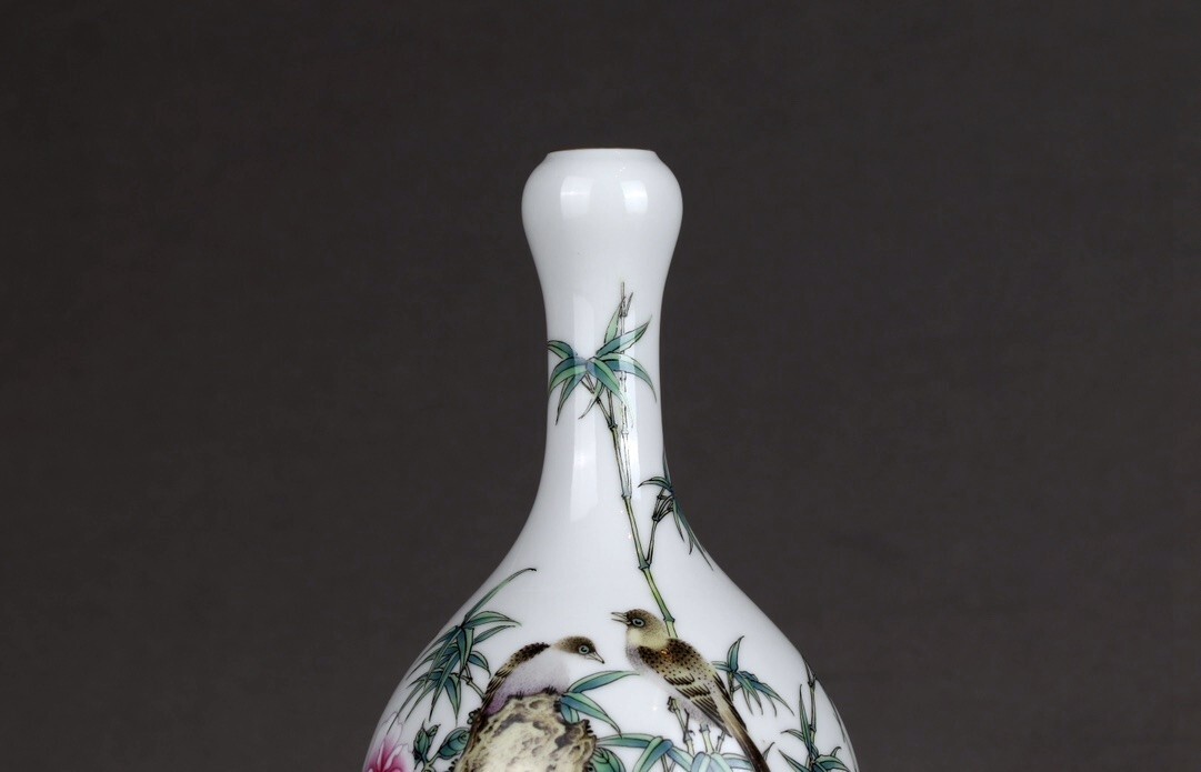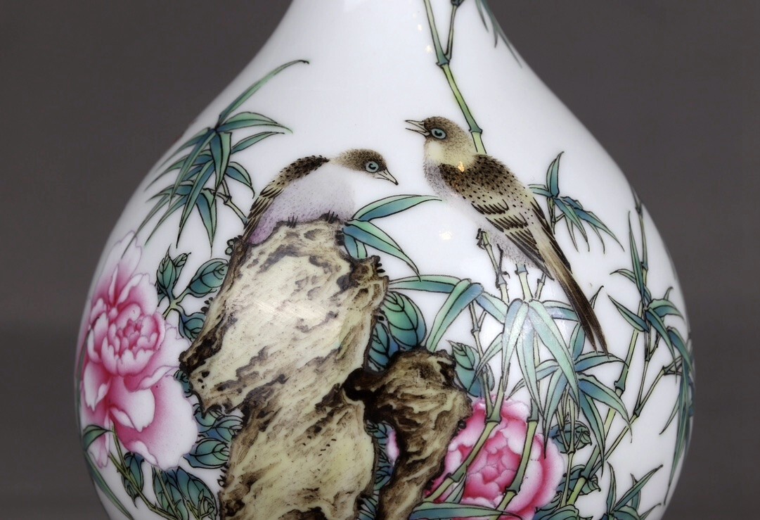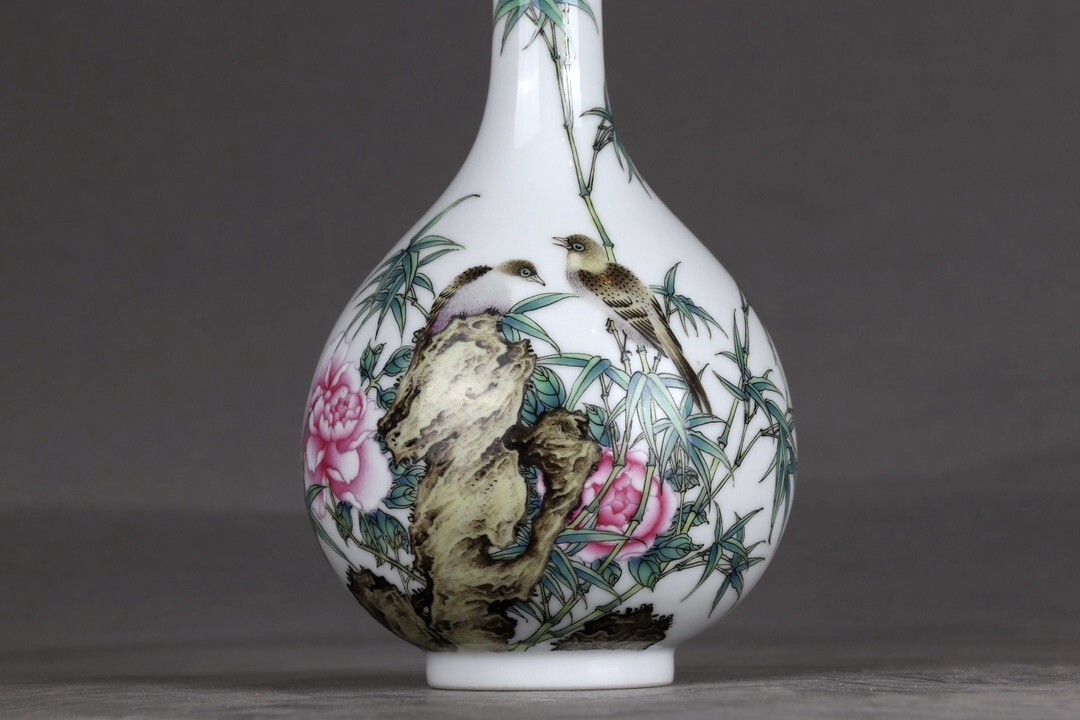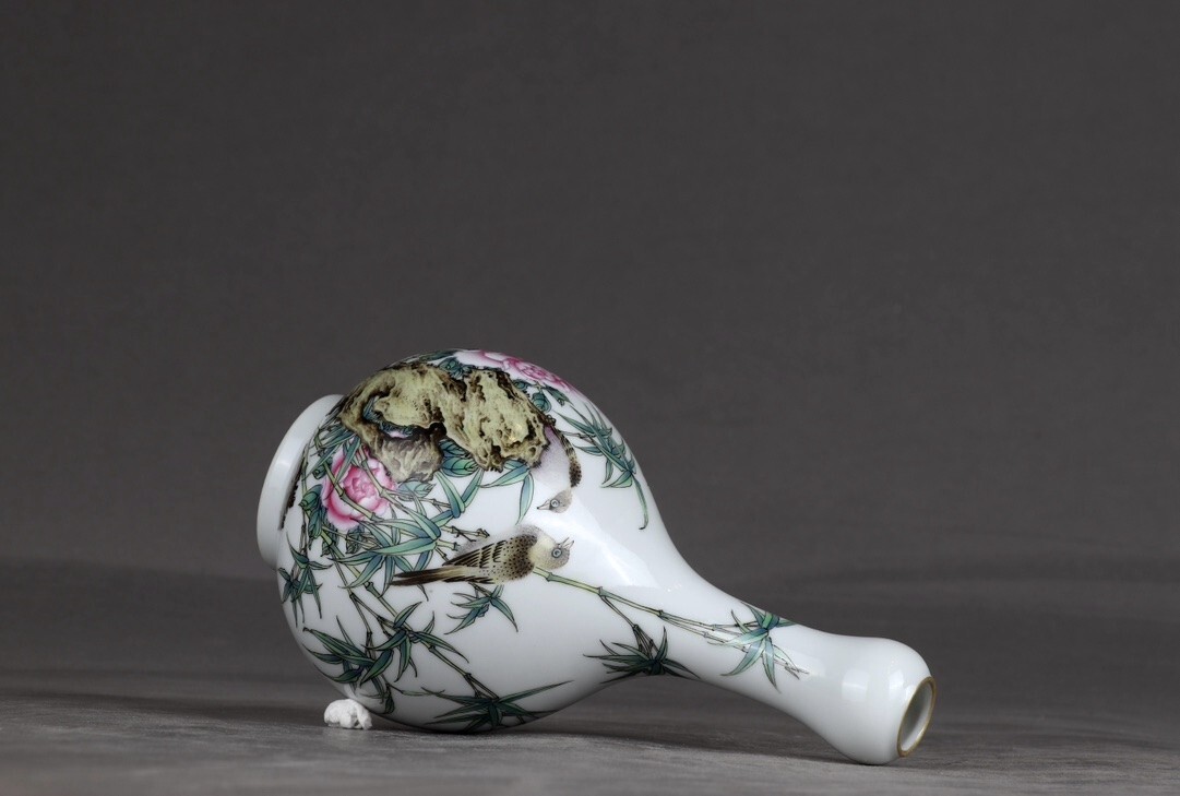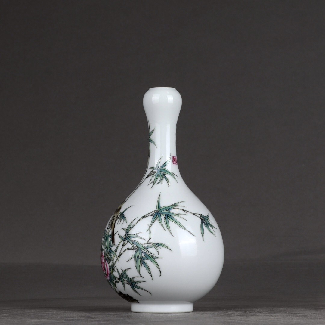 「清 乾隆年製 陶磁器 琺瑯彩花鳥紋 題詩蒜頭瓶」染付 置物 擺件 古賞物 中国古美術 旧蔵出