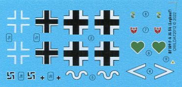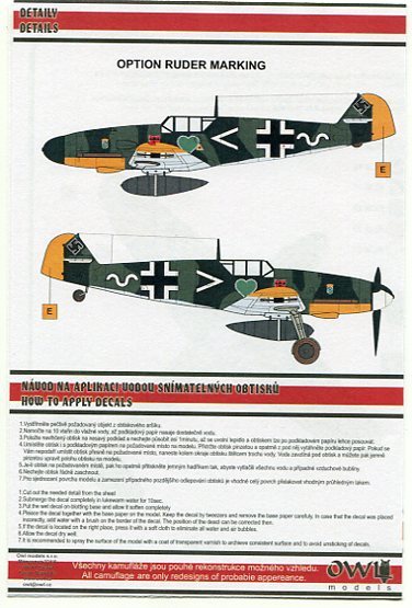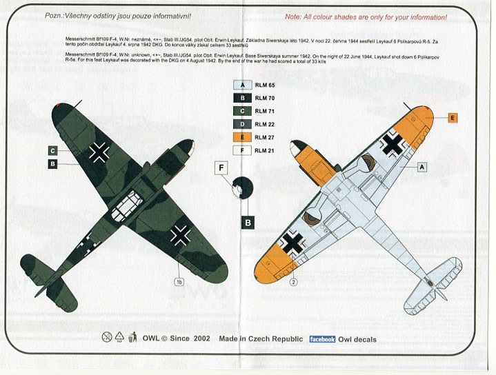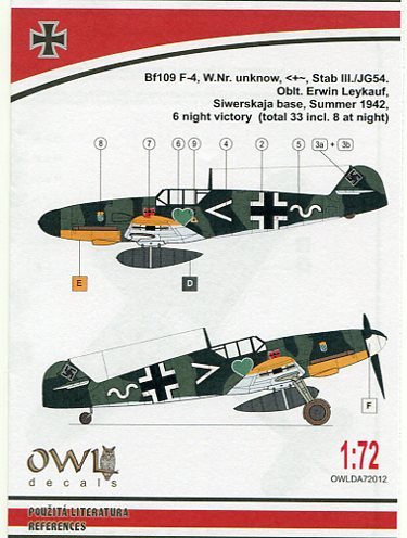 | Stab.Ⅲ/JG 54(第54戦闘航空団第3飛行隊本部小隊)のエルウィン・レイカウフ中尉のメッサーシュミットBf109F-4のマーキングです。1/72スケール用。新品です。A72012 | ||