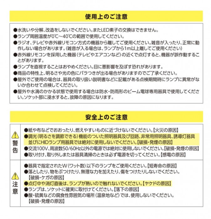 仕様 | 交流電源:100V 50/60Hz共用 口金サイズ:E26 定格消費電力(W):14.0 定格入力電流(A):0.23 設計寿命(h):40000 全光束(lm):1350 光色:昼光色相当 ビーム光束(lm):330 ビーム角(度):30 中心光度(cd):2600 防水設計:IP65 ※防水、防雨形のビーム電球専用器具使用時 |