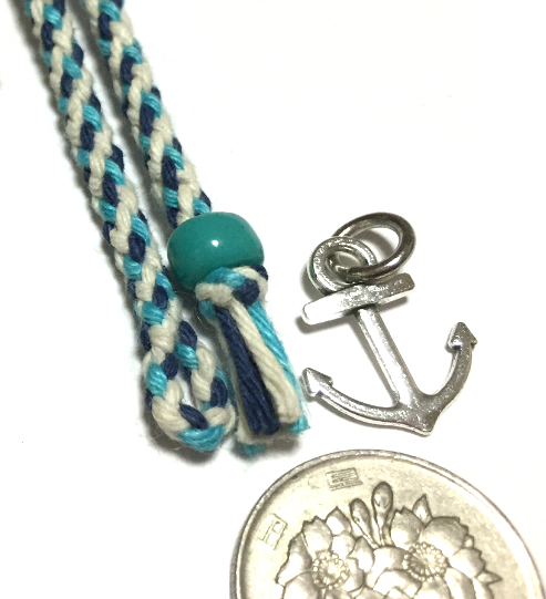 輪にイカリを引っ掛けて留め、ビーズを持って房を引くとサイズ調整できます。