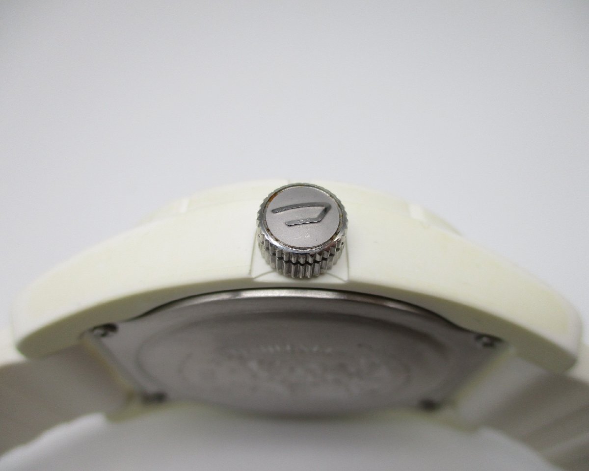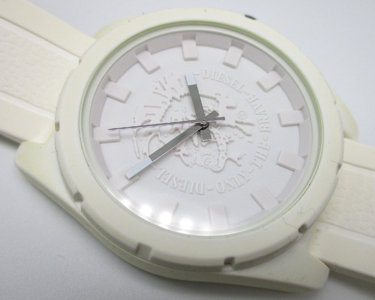 | DIESEL ディーゼル RUBBER COMPAMY ラバーカンパニー メンズ・クォーツ・SS/ラバー・5気圧防水仕様 【型番】DZ-1590 【およそのサイズ】ケース径:46.9mm 【状態】ガラスに目立った傷はありません。文字盤、針に汚れやサビは見られません。ホワイトパーツにやや変色が見られます。 クォーツ時計の入っている電池はモニター電池扱いでお願いいたします。発送までに止まった場合は電池交換後、発送いたしますが、その後の電池切れの際は、落札者様御自身でメーカーもしくは一般店に電池交換にお出しください。 【付属品】箱・保証書等は無く、時計のみです。 | ||||