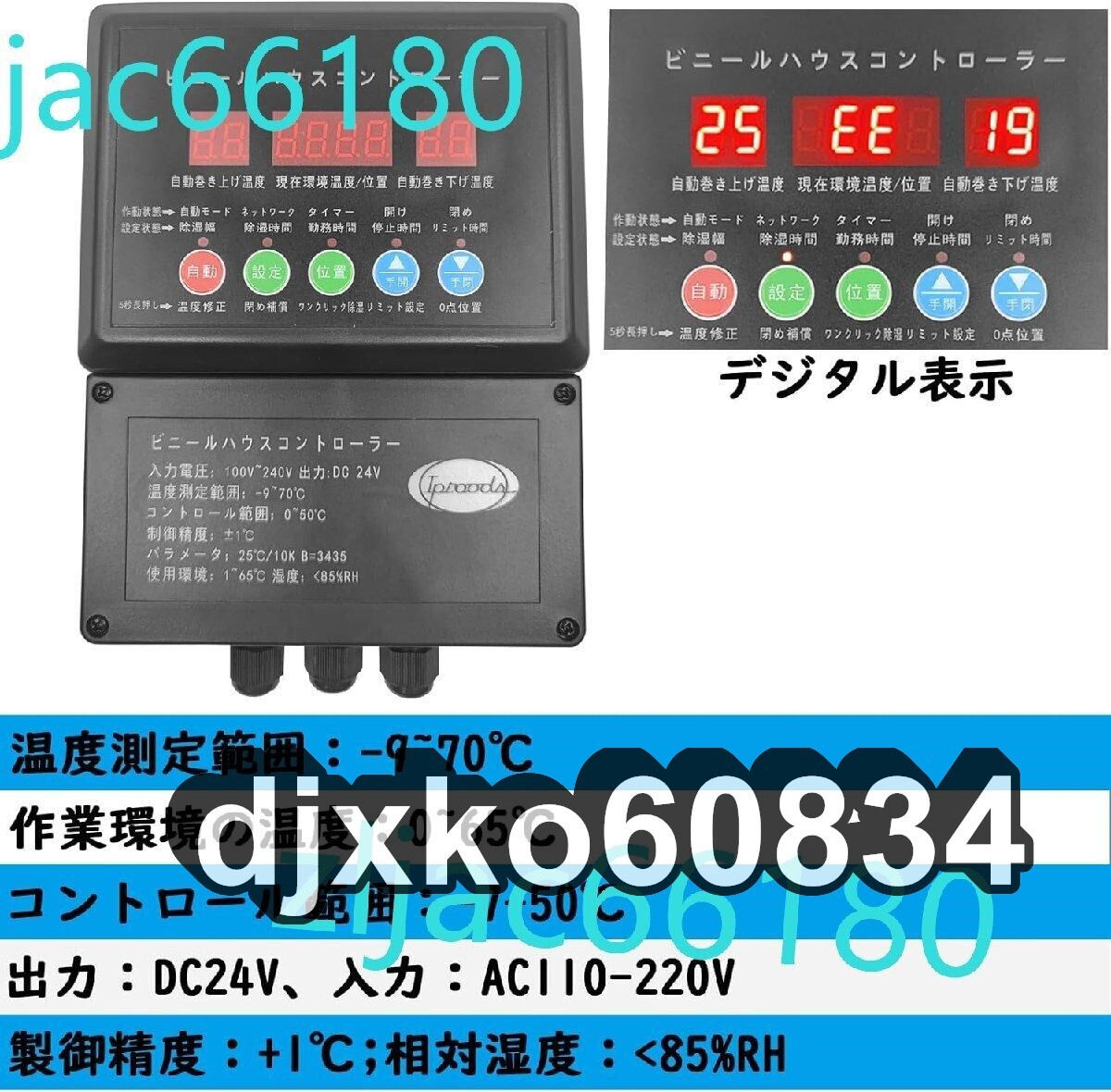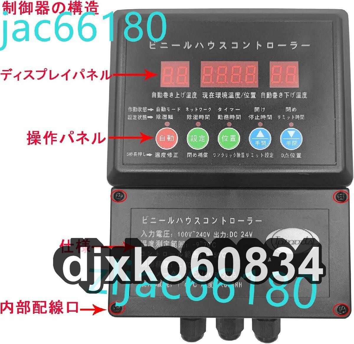 自動式フィルム巻上げ換気装置は3つのデジタル管表示窓で、5つのキーで操作し、使いやすい; この制御器はAC110-220VのコンセントとDC24Vのモーターを接続します。巻き上げ温度と巻き下げ温度およびその他の関連パラメータを設定し、上巻モータを製御し、自動化でビニールハウスを開け、ビニールハウスを閉めることを実現する; 自動式フィルム巻上げ換気装置は農業用ビニールハウス用に適している。自動式フィルム巻上げ換気装置によって農業用ビニールハウスの自動化通風、日除け、防雨を実現する。 制御器 出力:DC24V、入力:AC110-220V; 作業環境の温度:0~65℃; 温度測定範囲:-9~70℃; コントロール範囲:-7-50℃; 相対湿度: