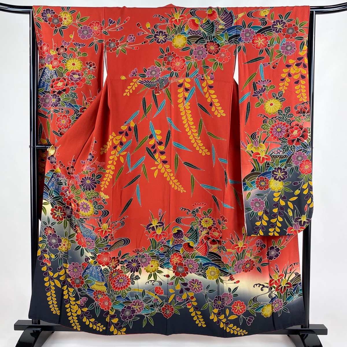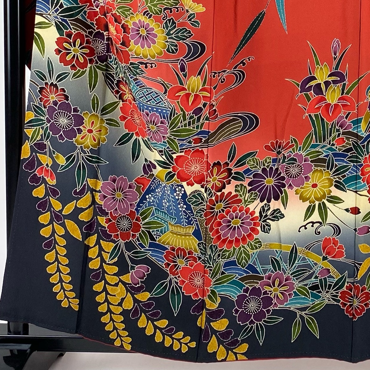 振袖 名品 草花 家屋 染め分け 朱色 袷 身丈159 裄丈65 M 正絹 【中古】 |