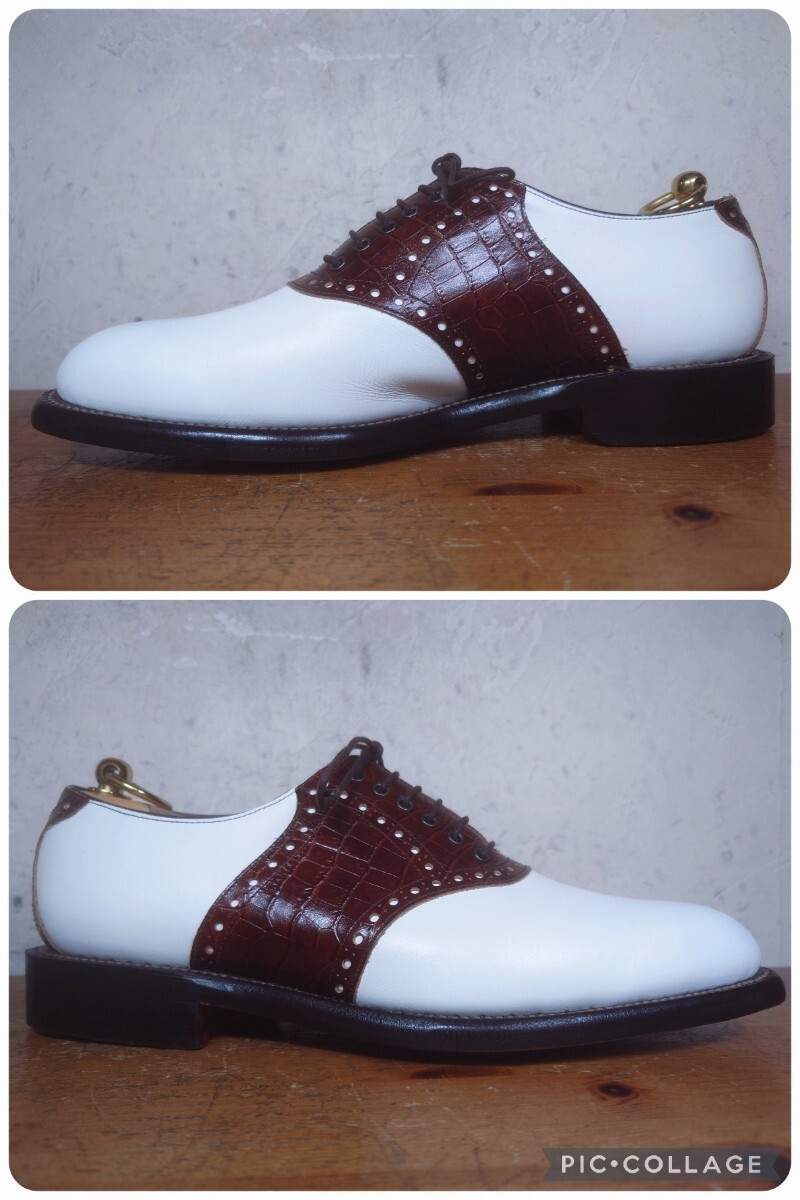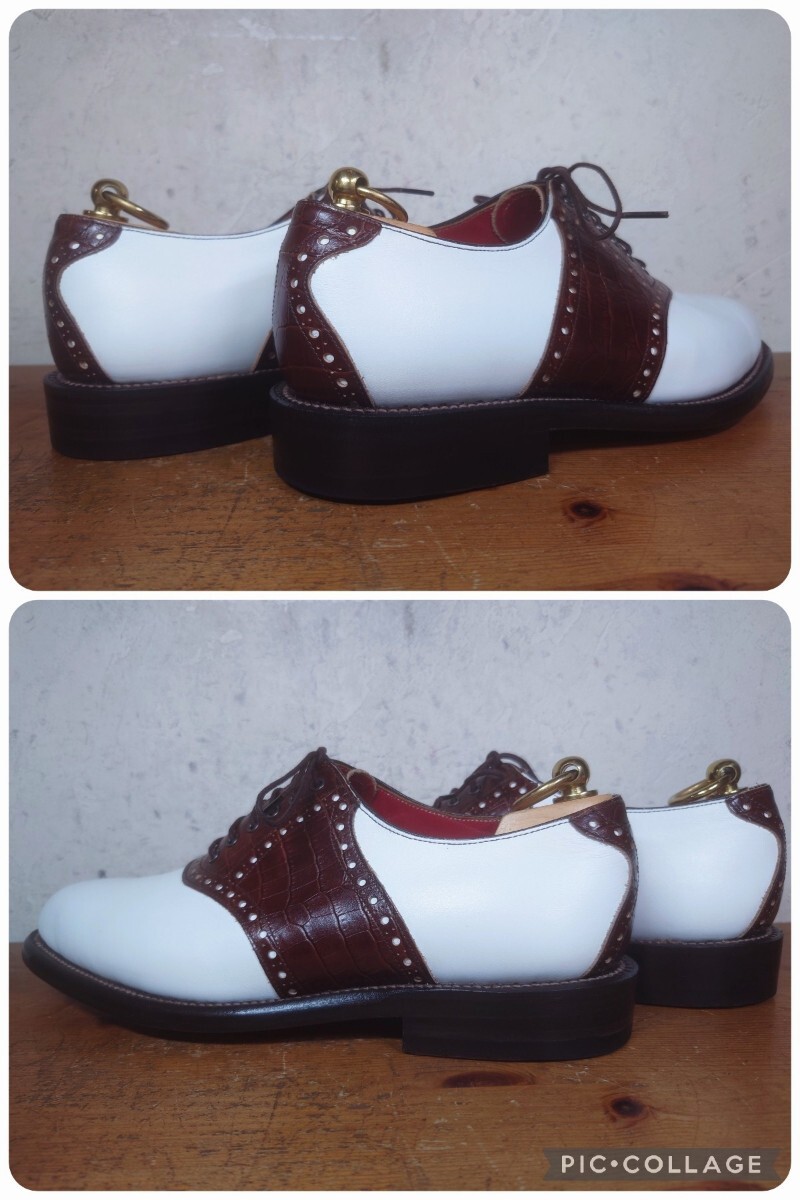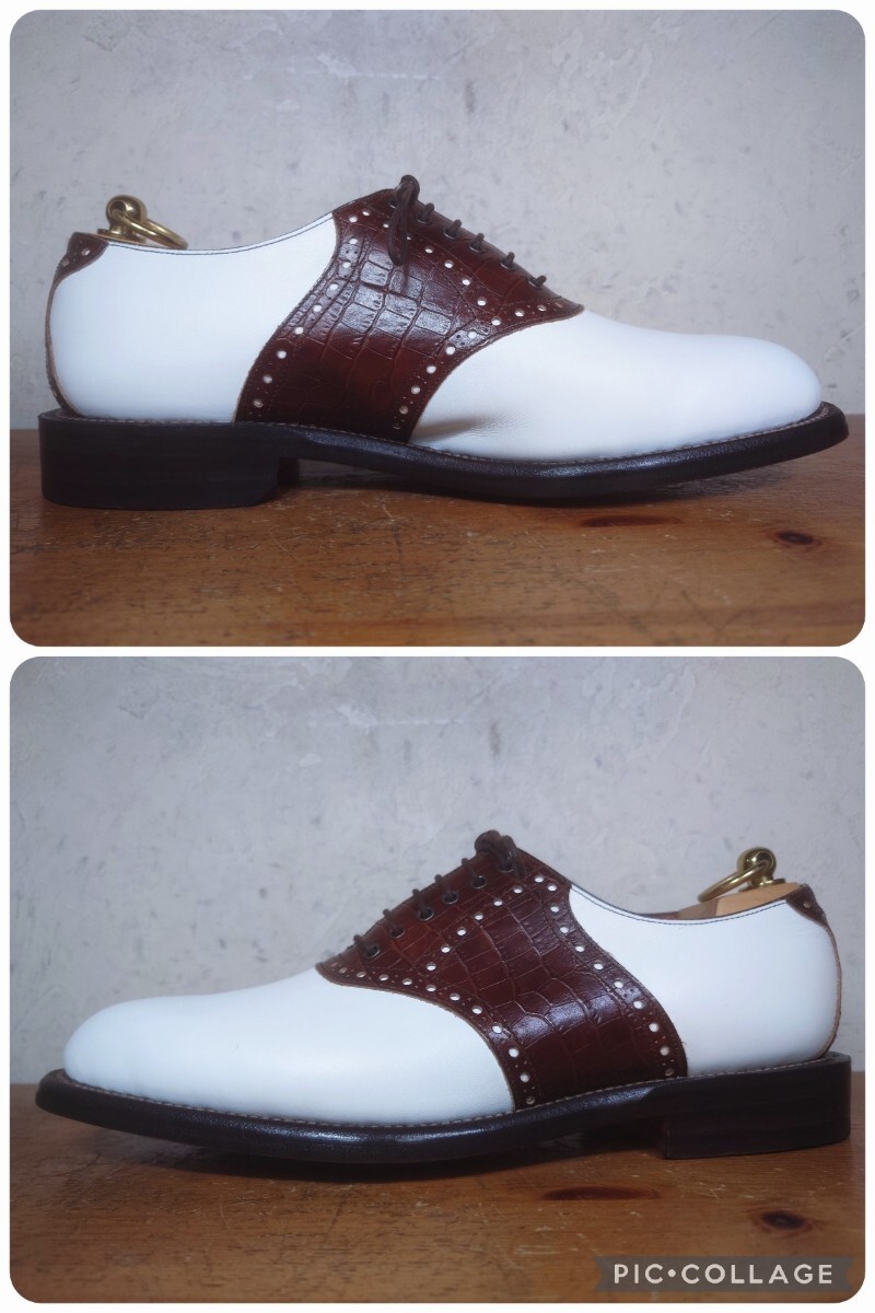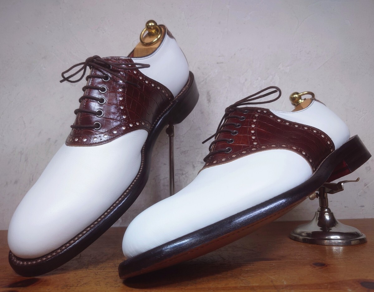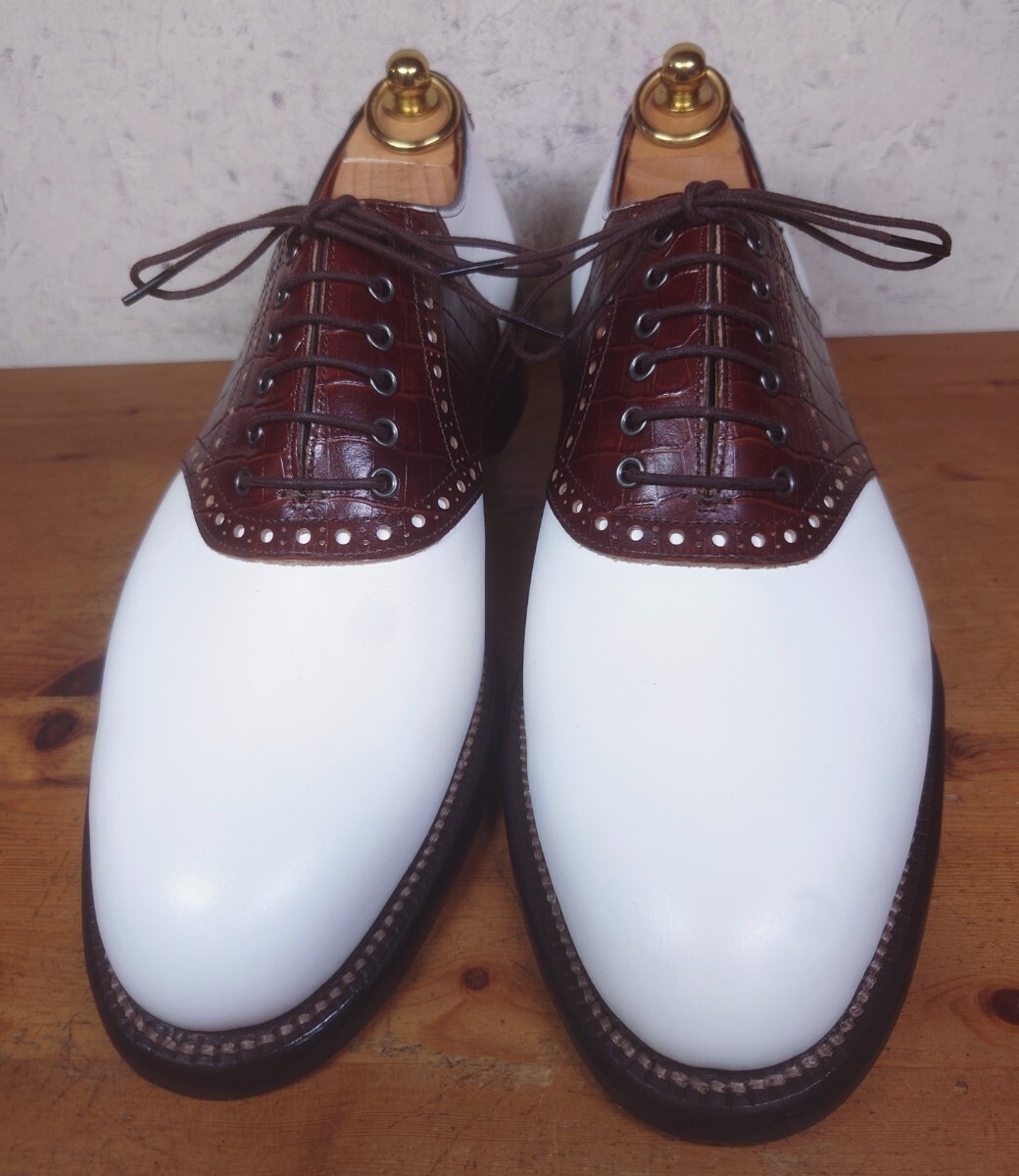 通常はオーダー出来ないクロコダイル型押しレザーとホワイトのキップレザーのコンビネーション、アウトソールはダブルレザーソール、オールアラウンドグッドイヤーウェルト製法の頑丈な作りです。