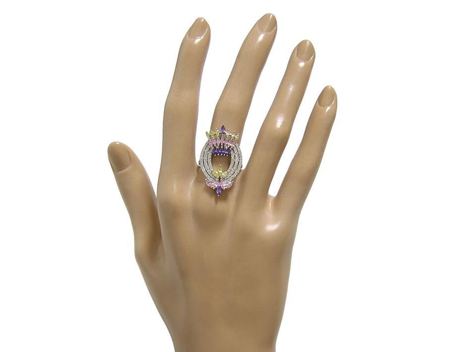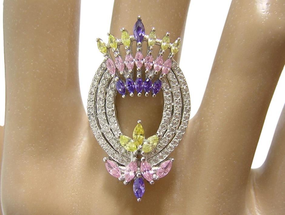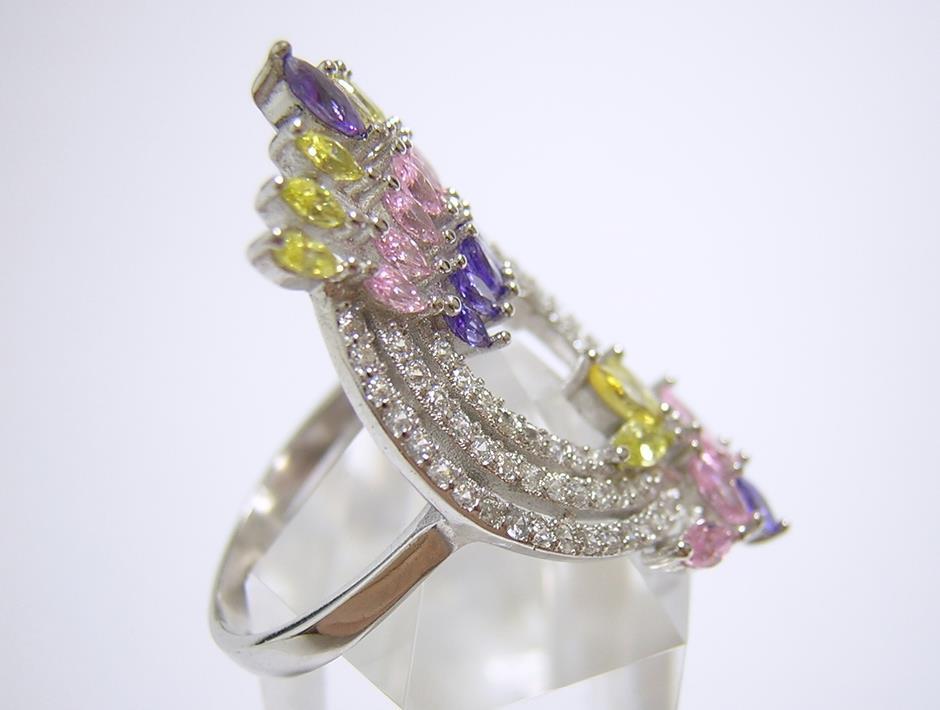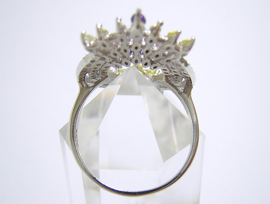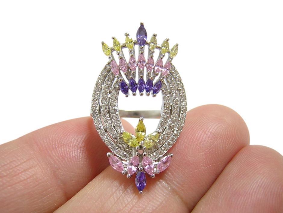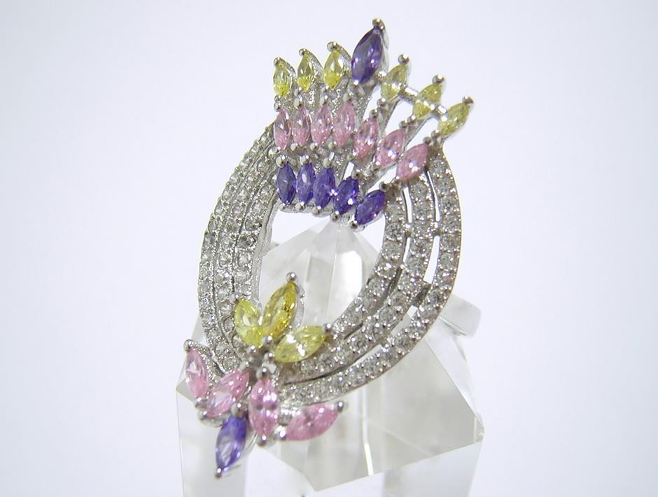 4色のキュービックジルコニアを使用したデザインリングです。 【石名】キュービックジルコニア 【カット】マーキスカット、ラウンドカット 【重さ】4.9g 【サイズ】15.75号 (お直しは承れません) デザイン部:縦31mm×横19mm 【素材】シルバー925 (14金ホワイトゴールド仕上げ) 【刻印】S925 【状態】新品 ※地金部分に製作時からの微細な小傷やスレがあります。 |