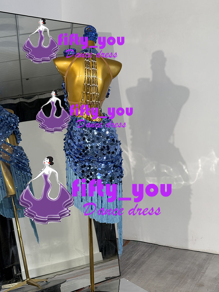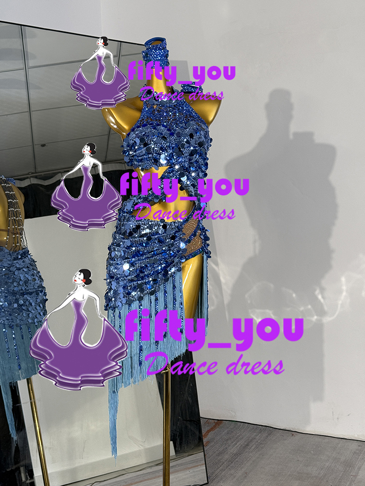 新品fifty_youオリジナルデザイン レディース社交ダンス衣装  ラテンドレス 上品新作 セミオーダー  キラキラ飾り ブルー系