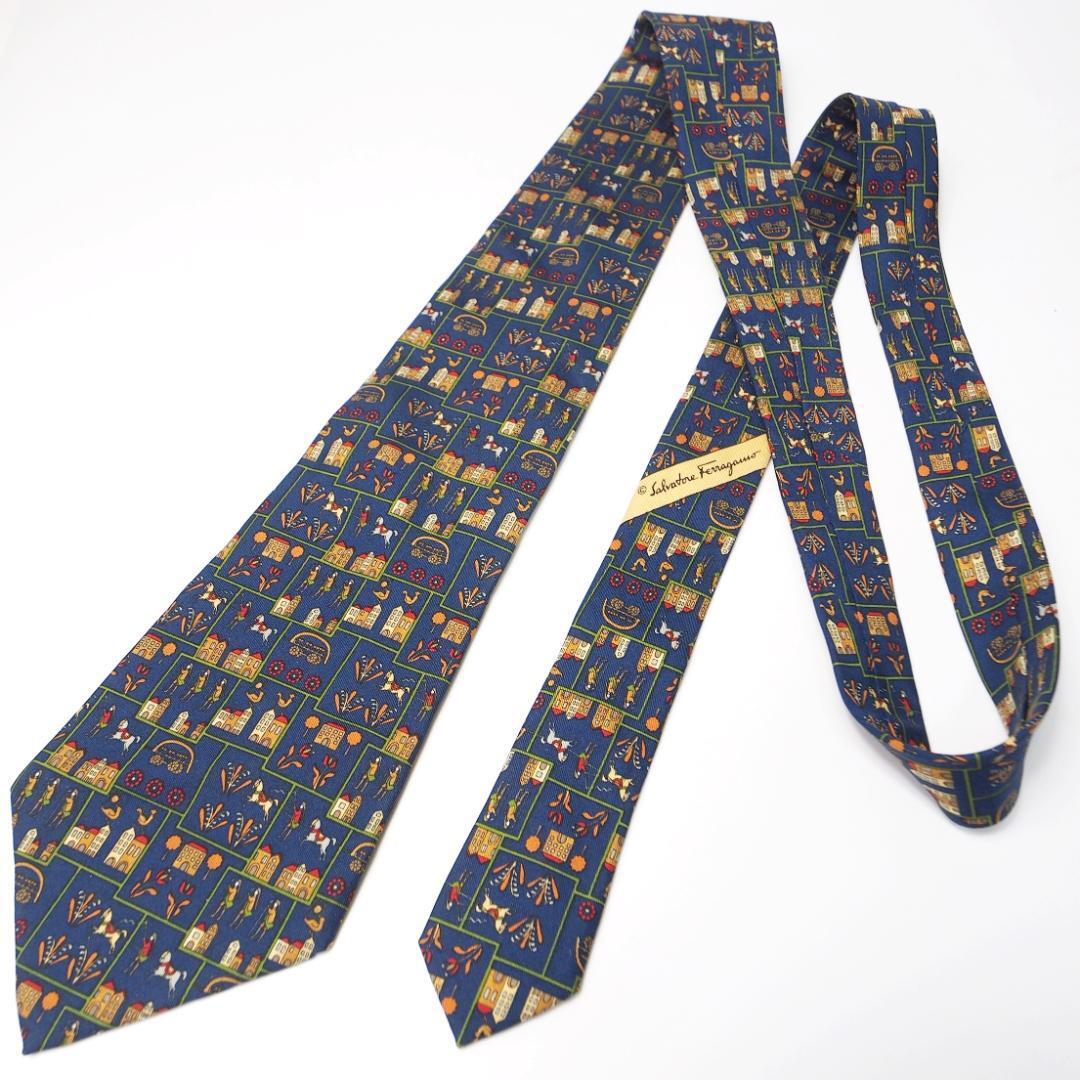 イタリア製 サルバトーレフェラガモ Salvatore Ferragamo ネクタイ シルク100% 総柄 ネイビー系