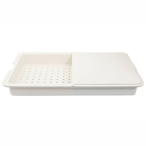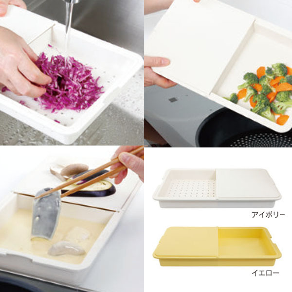 NATURE カット&トレー アイボリー ・キッチンスペースを有効活用できるトレー付きまな板。 ・両面使用のまな板でトレーとザルを使い分け。 ・切った後の野菜の皮などをスライドさせてトレーに移し集めておくことで、テンポよくお料理ができ、後の方付けも簡単。 ・ザルに移せばそのまま水切りできます。 抗菌加工品(SIAA 登録)」「食洗機OK」 サイズ 商品サイズ(約):縦350×横200×高43mm 商品重量(約):270g 袋入サイズ(約):縦202×横45×高352(+ヘッダー30)mm 袋入重量(約):330g 素材 トレー・まな板:ポリプロピレン すべり止め:エラストマー ブランド 伊原企販 |