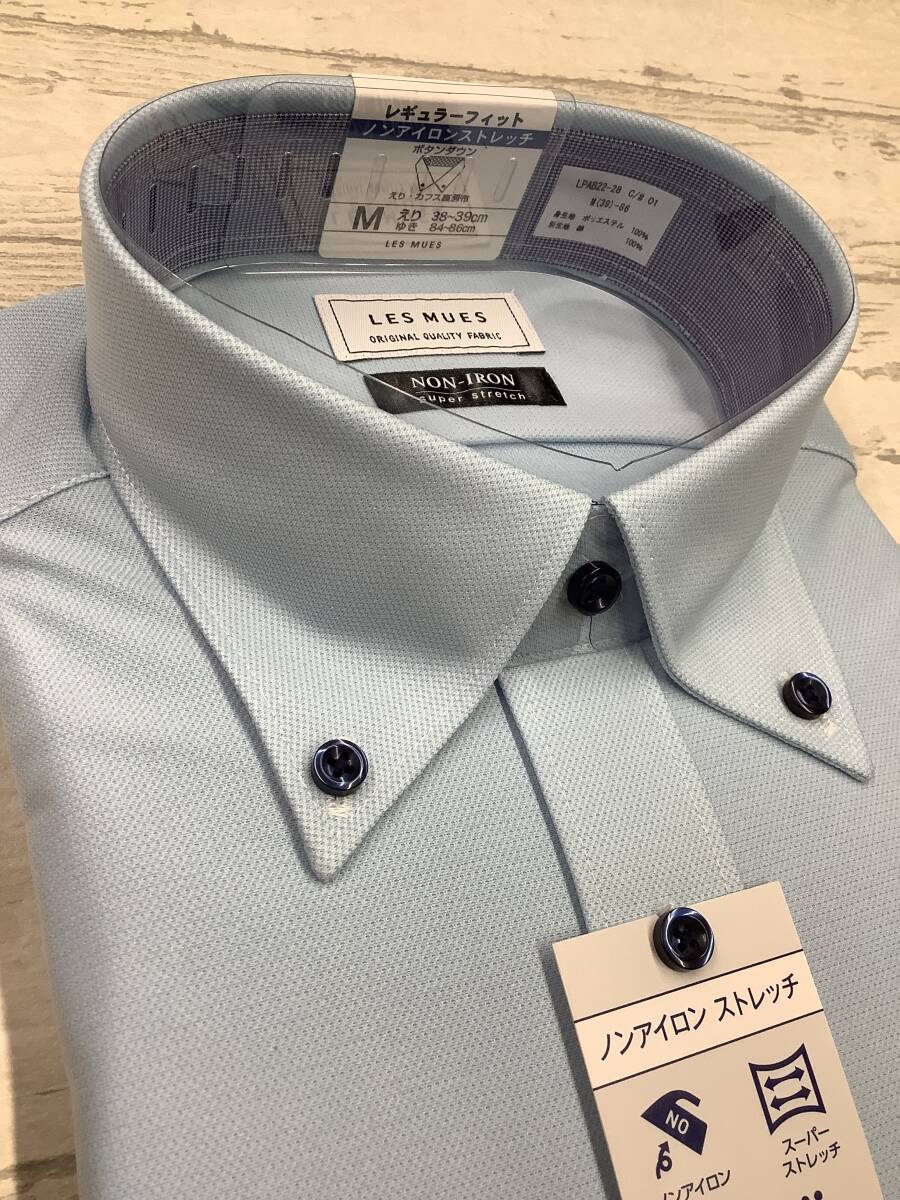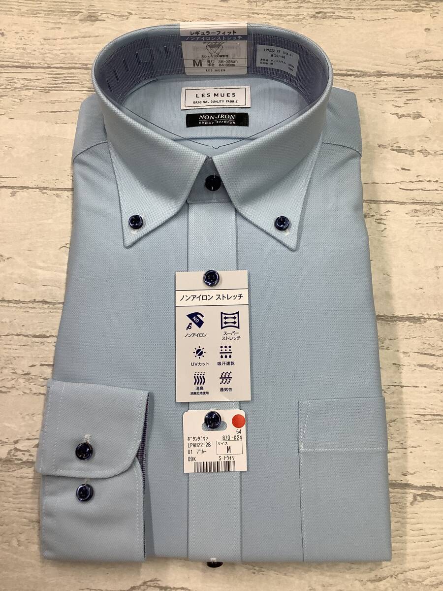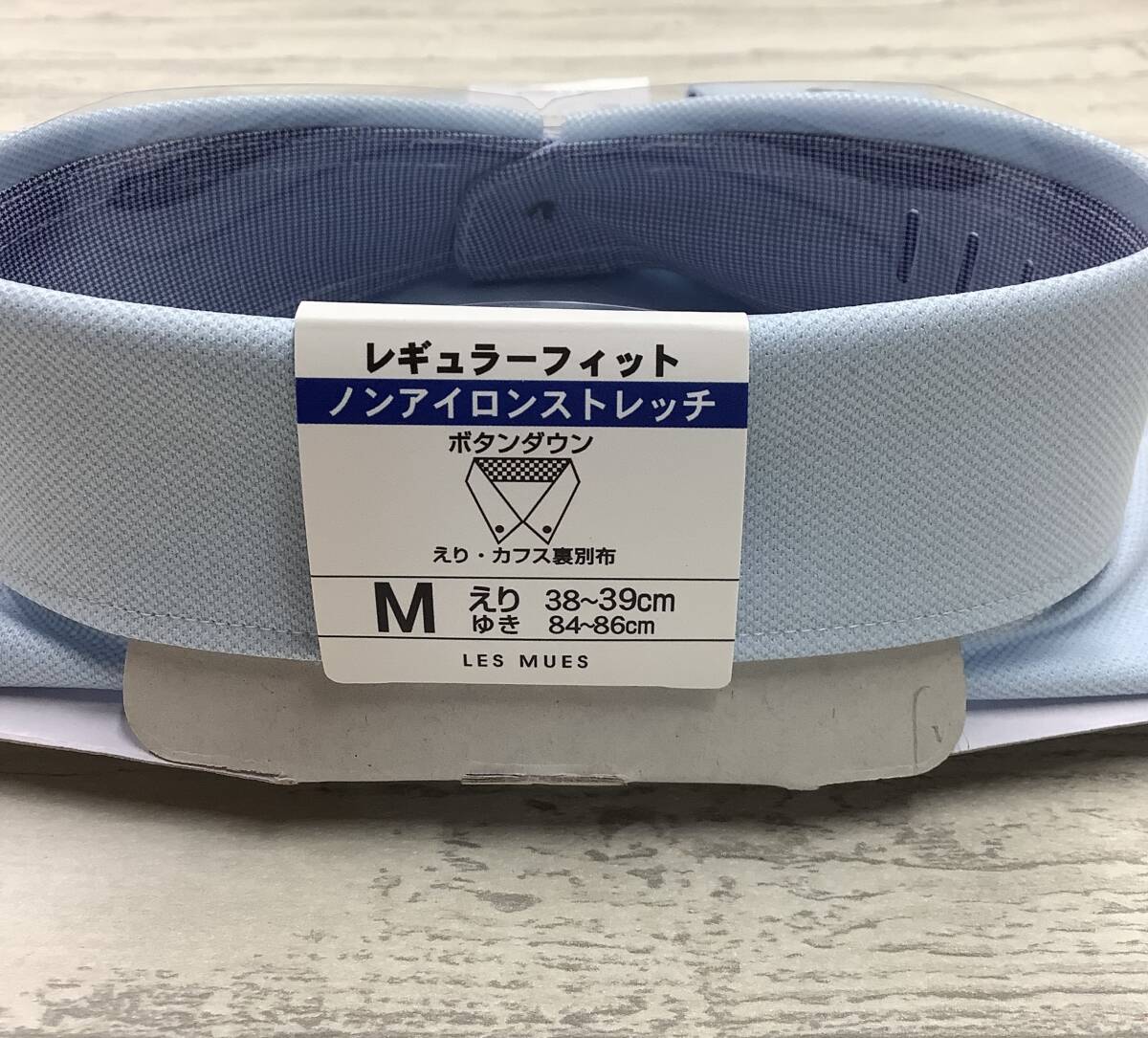 39-86 長袖Mサイズ ★定価4,990 ノンアイロン ポリエステル100% スーパーストレッチ素材  ★ブルー系ボタンダウンシャツ