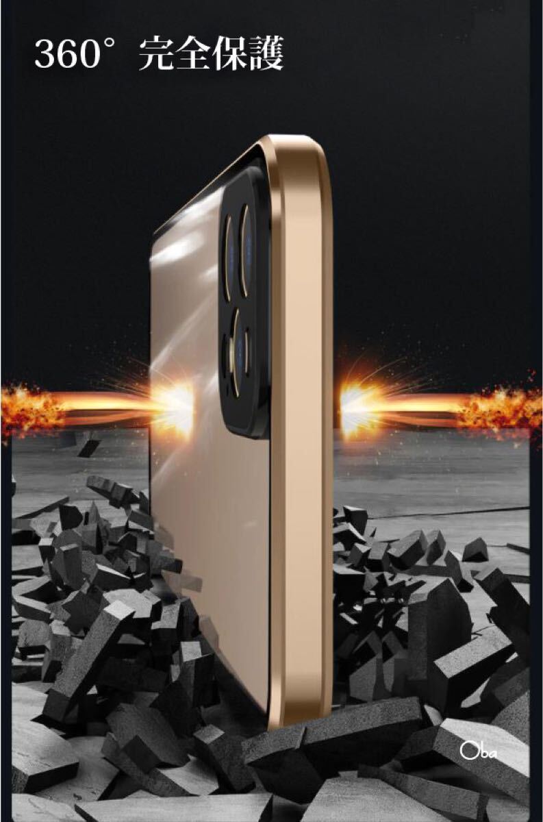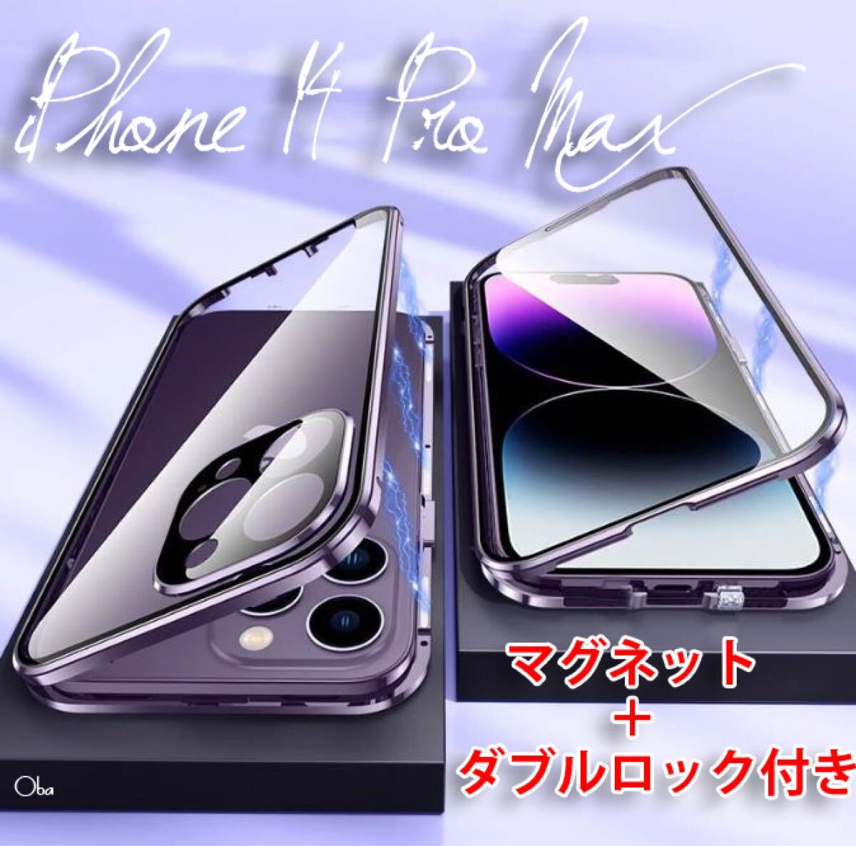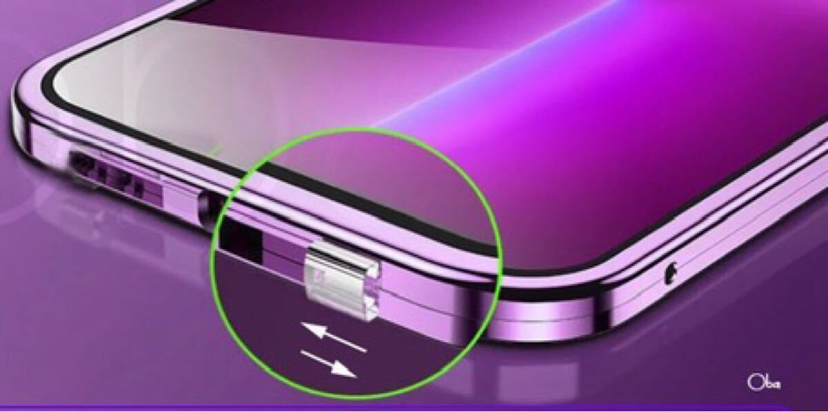 iPhone14ProMaxケース パープル マグネット&ロック アルミ合金 両面ガラスケース フィルム不要ケース