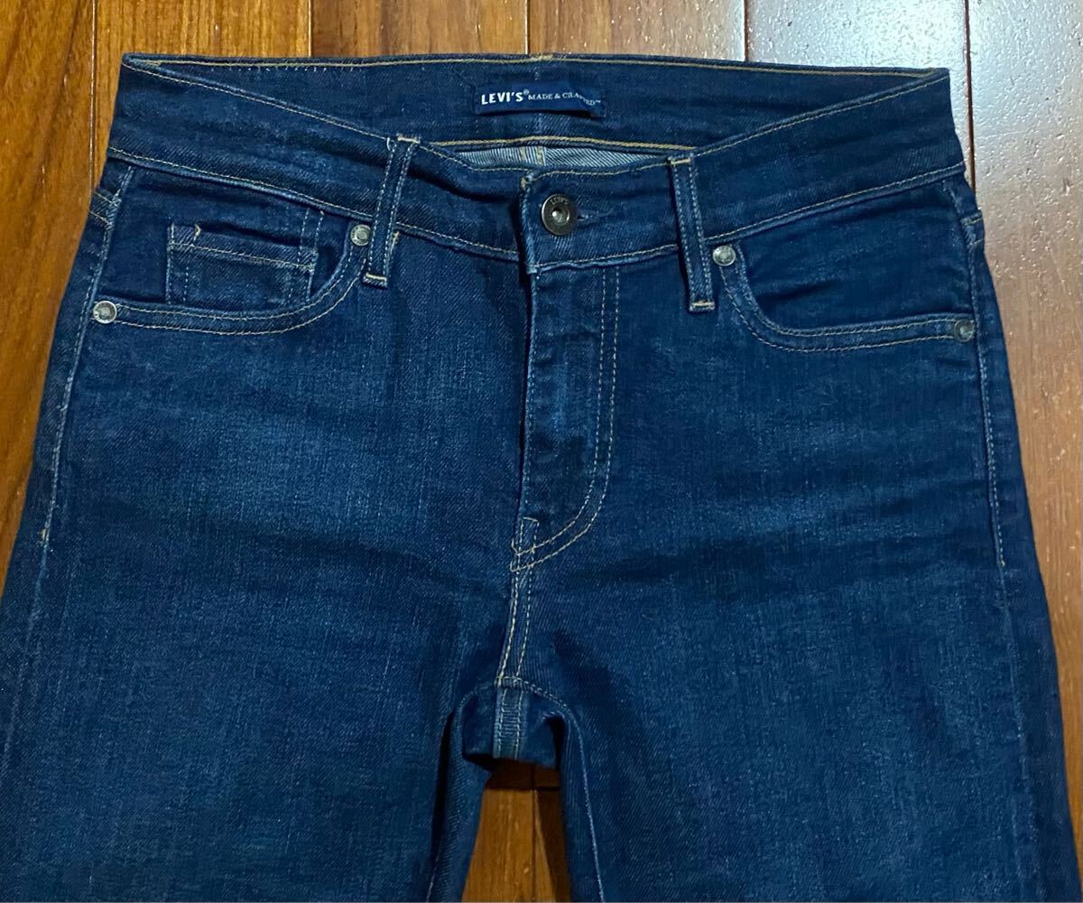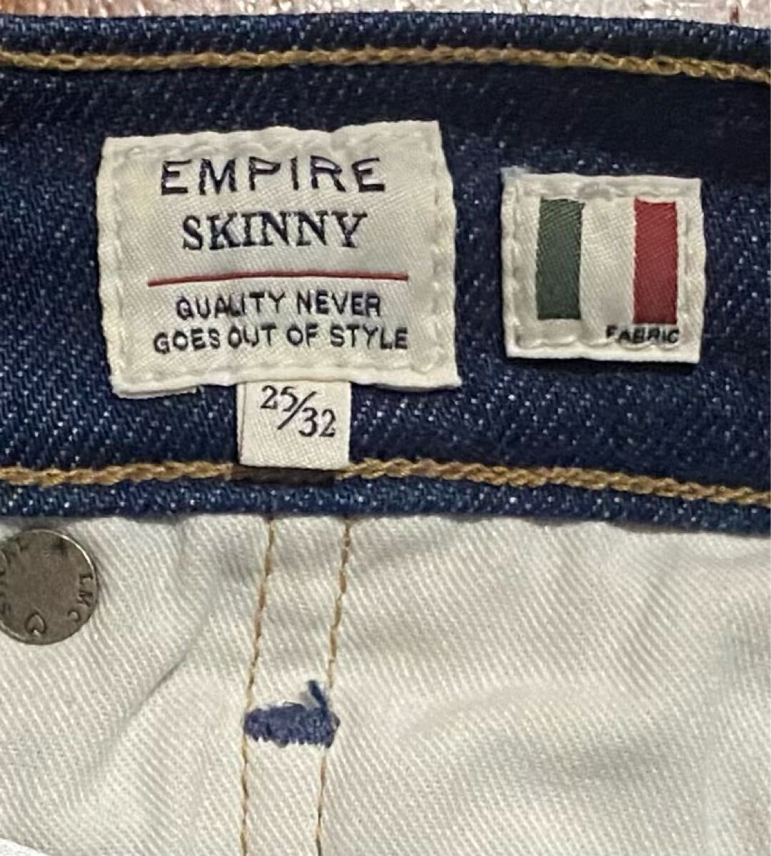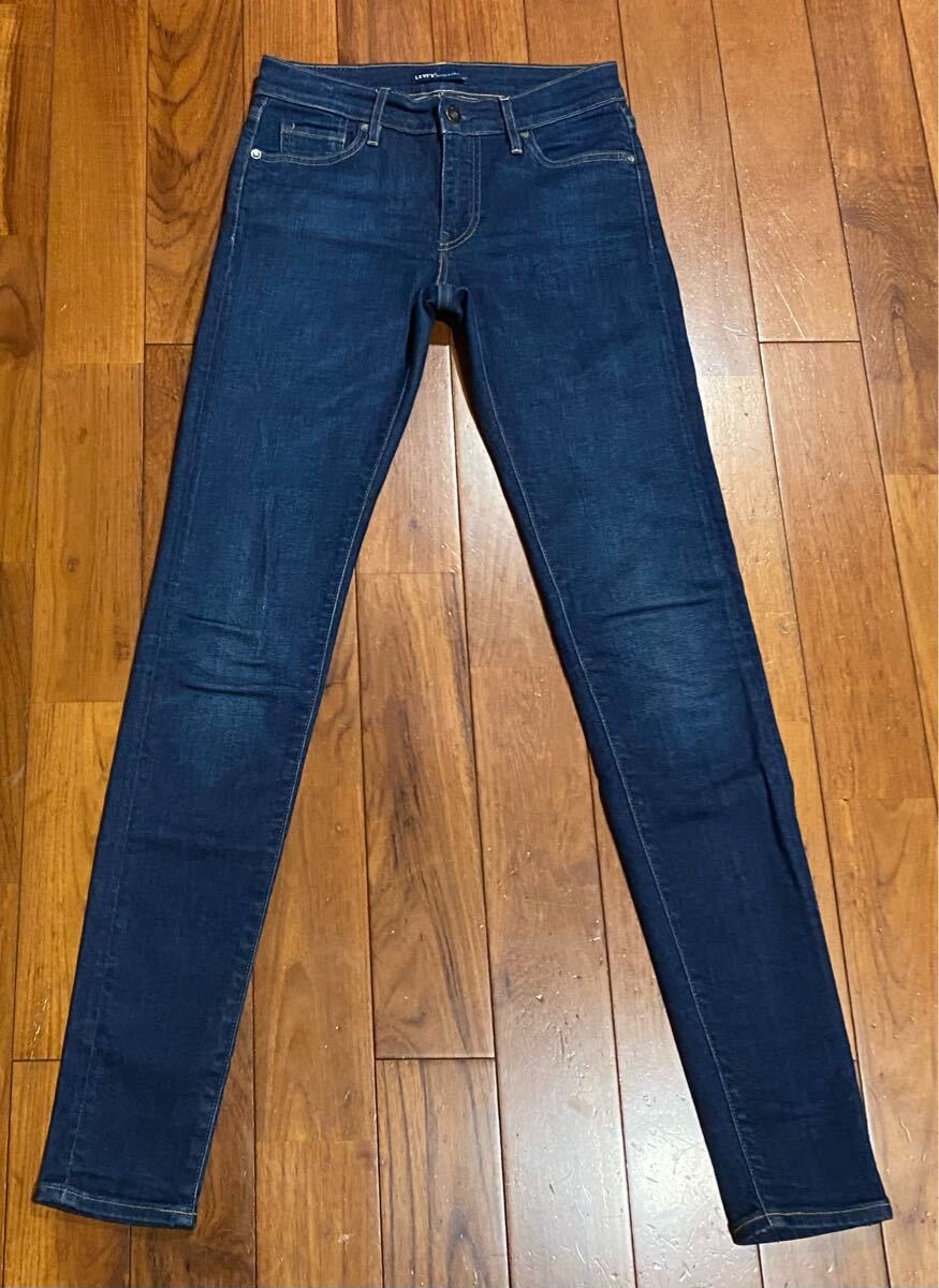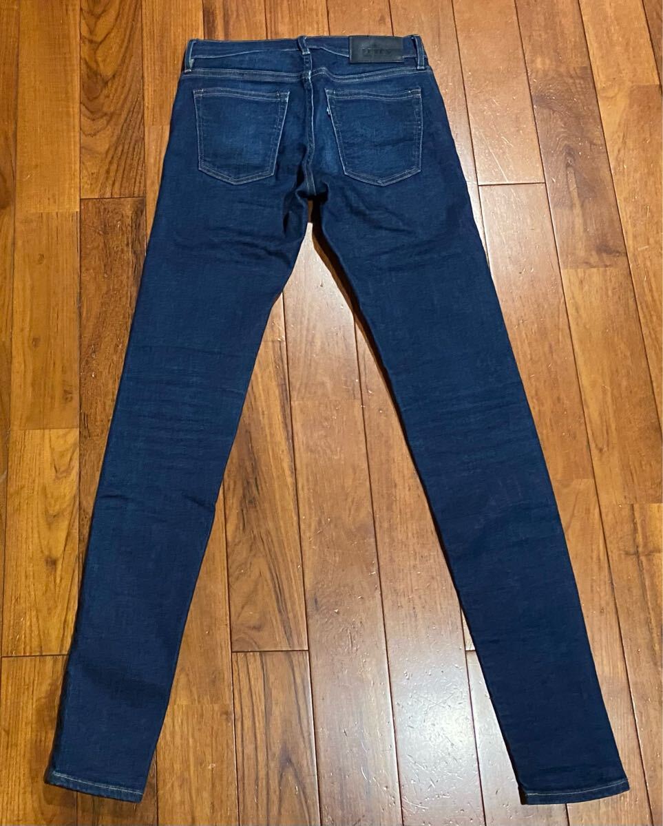 リーバイスのストレッチスキニーデニム(ジーンズ)、EMPIRE SKINNY 26996-0007です。色はインディゴブルーです。USEDですが状態は良いです(10段階中8程度)。生地はストレッチ入りで綿92%、ポリエステル6%、ポリウレタン2%です。牛革パッチ、ジッパーフライ、裾はチェーンステッチです。正規品です(トルコ製)。サイズはW25×L32でウエストは重ねずに平置きで約68cm、ヒップ約85cm、股上約21cm、股下約82cm、股下15cmのふともも部分約41cm、裾まわり約24cm、重量約430gです。発送はゆうパケットポストになります。