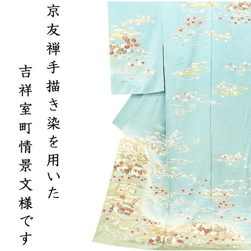 | ※記念感謝祭【仕立無料】京友禅伝統工芸手描染、本金☆別誂え生地☆吉祥室町情景文訪問着☆幅広仕様 |