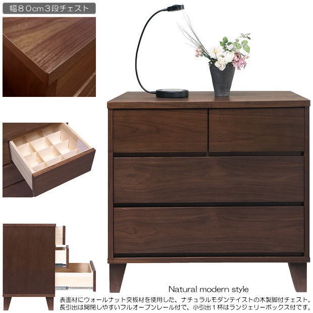| 【商品名】 | ウォールナット材仕様ナチュラルモダンテイストの木製脚付幅80cm3段ローチェスト | |