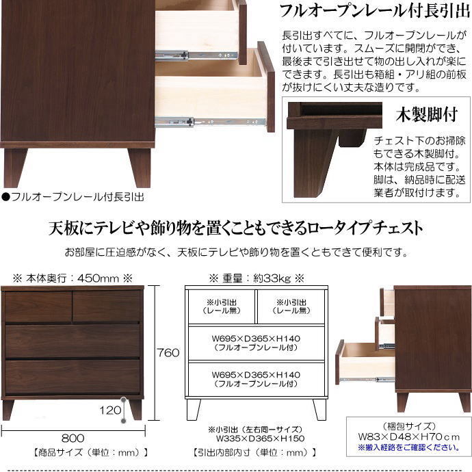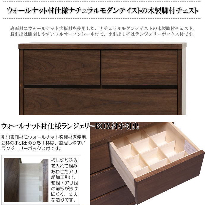 | 【商品特徴】 | ・表面材にウォールナット突板材を使用した木製チェスト。お部屋に圧迫感がなく、天板にテレビや飾り物を置くことができる高さ76cmのロータイプチェストです。 ・ナチュラルモダンテイストのお部屋づくりに最適です。 ・板に切り込みを入れて組みあわせたアリ組加工引出。箱組・アリ組の前板が抜けにくく、丈夫な造りです。 ・長引出すべてに、最後まで引き出せるフルオープンレールが付いていますす。スムーズに開閉ができ、物の出し入れが楽にできます。 ・2杯の小引出のうち1杯は、整理しやすいランジェリーボックス付です。 ・チェスト下のお掃除もできる木製脚付です。(本体は完成品です。脚は、納品時に配送業者が取付けます。) | |