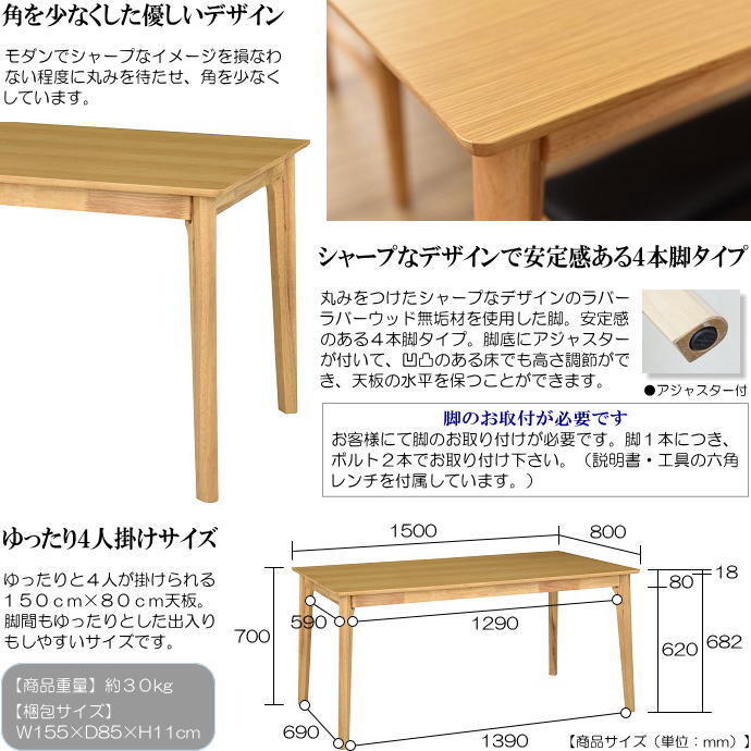 | 【商品特徴】 | ◇オーク突板材天板のナチュラルモダンスタイル4人掛け用幅150cmダイニングテーブルの単品販売です。 ・天板に綺麗な木目でナチュラル感のあるオーク突板材を使用しています。(芯材はMDF繊維板です。) ・モダンでシャープなイメージを損なわない程度に丸みを待たせ角を少なくしています。 ・丸みをつけたシャープなデザインの脚はラバーウッド無垢材を使用しています。 ・脚の底にはアジャスターが付いています。凹凸のある床でも、ネジ式で簡単に調節ができ天板の水平を保つことができます。 ・ゆったりと4人が掛けられる150cm×80cm天板。脚間もゆったりとした出入りもしやすいサイズです。 ・お客様にて、脚のお取り付けが必要となっております。(脚1本につき、ネジ2本をお取り付け下さい。説明書・工具の六角レンチを同梱しております。) | |