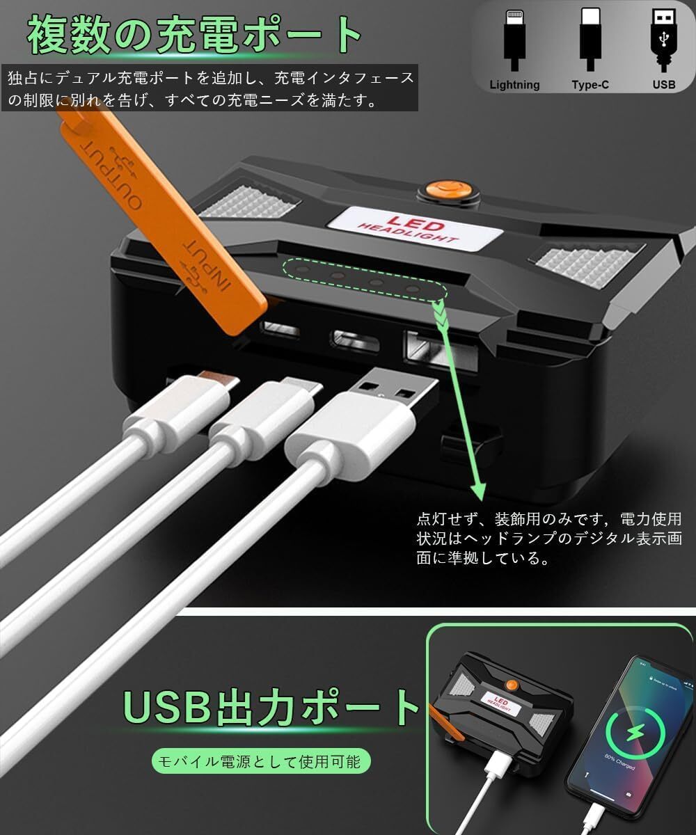 • 2つの充電ポートをアップグレードし、異なるスマートフォン機器と充電ケーブルに完全に適合し、使用の便利性を大幅に向上させ、外出時に1本の充電ケーブルのみを持参で済みます。3000ミリアンペア大容量18650バッテリを3つ搭載することで、総容量が9000ミリアンペアとなり、航続時間が大幅に向上しました。使用中に重いと感じた場合は、荷重を軽減するためにバッテリを1つか2つ取り出すこともできます。この動作はヘッドライトの明るさに影響しません。