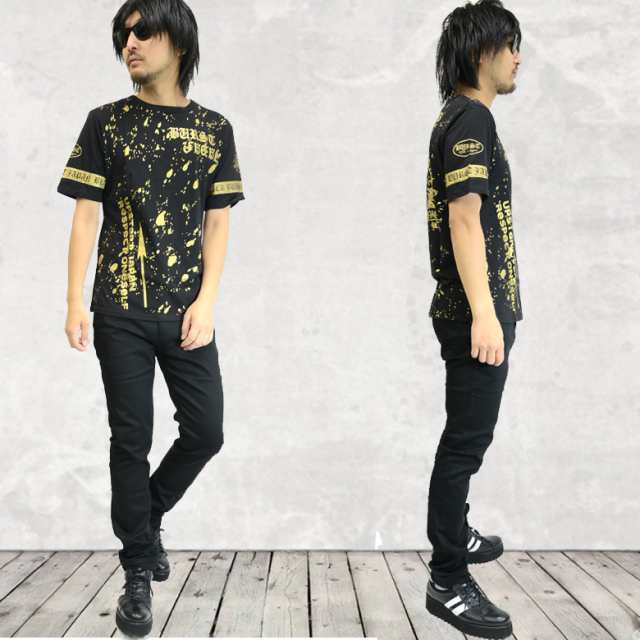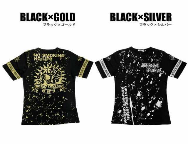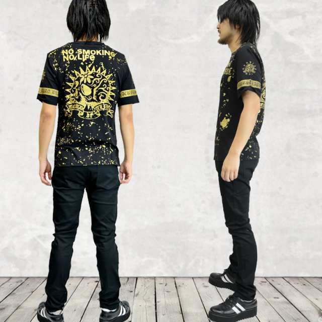 BURST JAPAN ペイント加工&メキシカンスカル半袖 ストレッチ Tシャツ 70559 ブラックxゴールド L