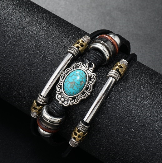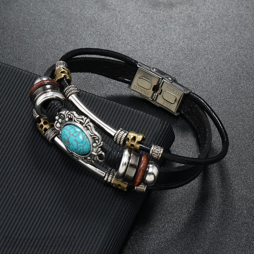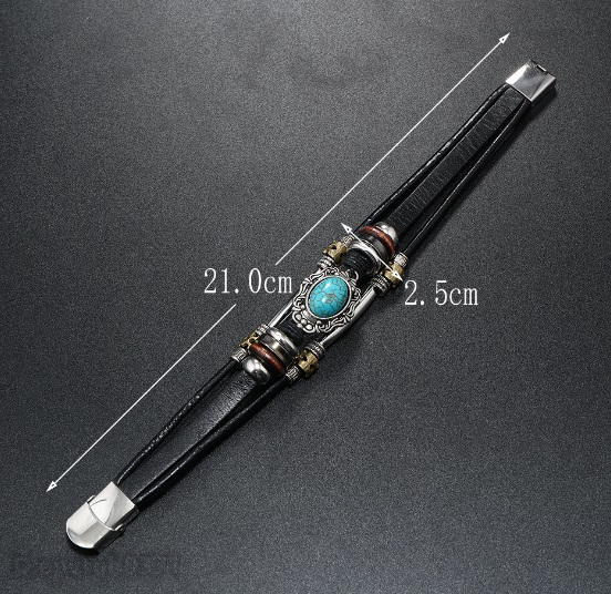 ブレスレット 新品 メンズ レザーバングル ボヘミア 緑松石 チタンステンレス 紳士 アクセサリー 総長21センチ 長さ調整可能 /黒