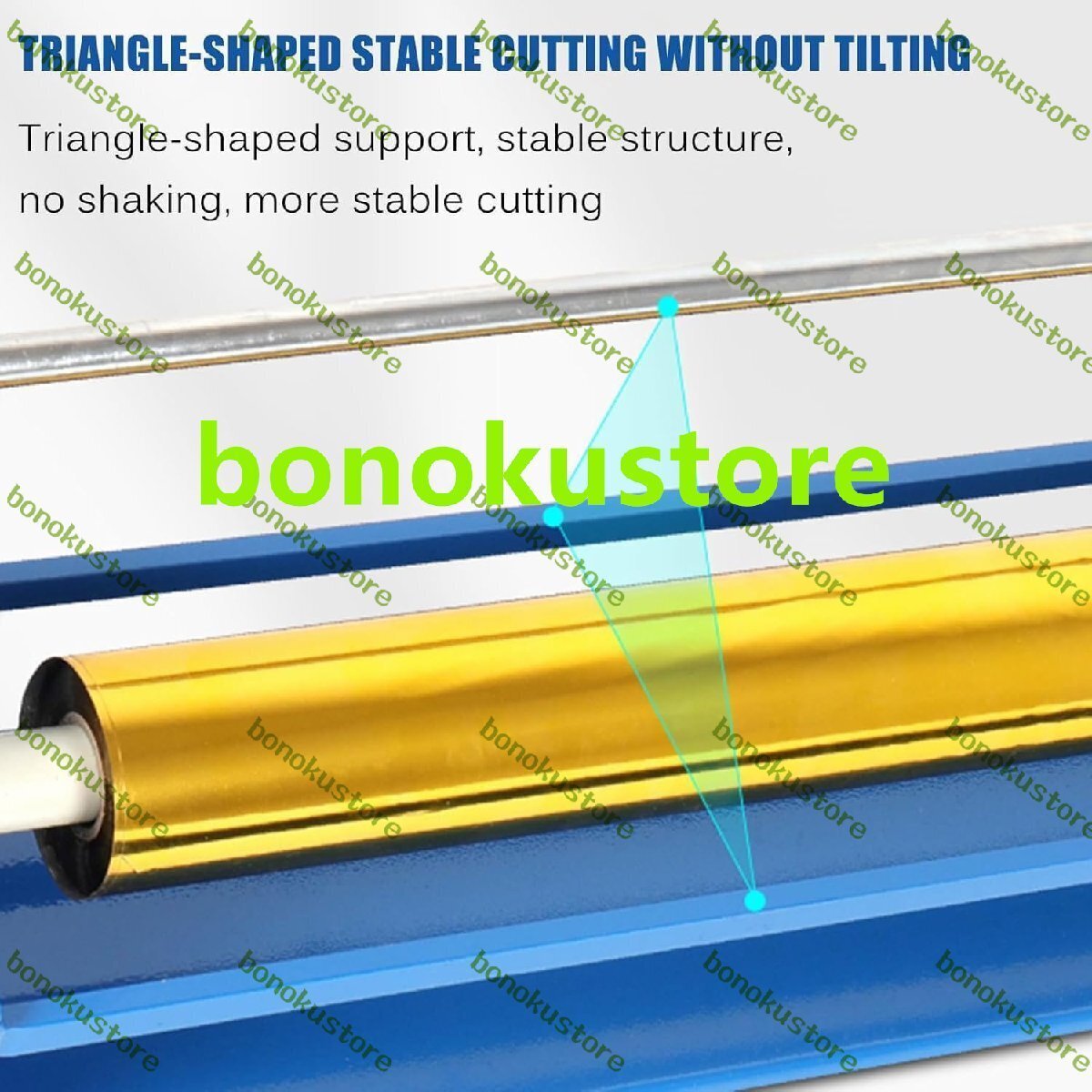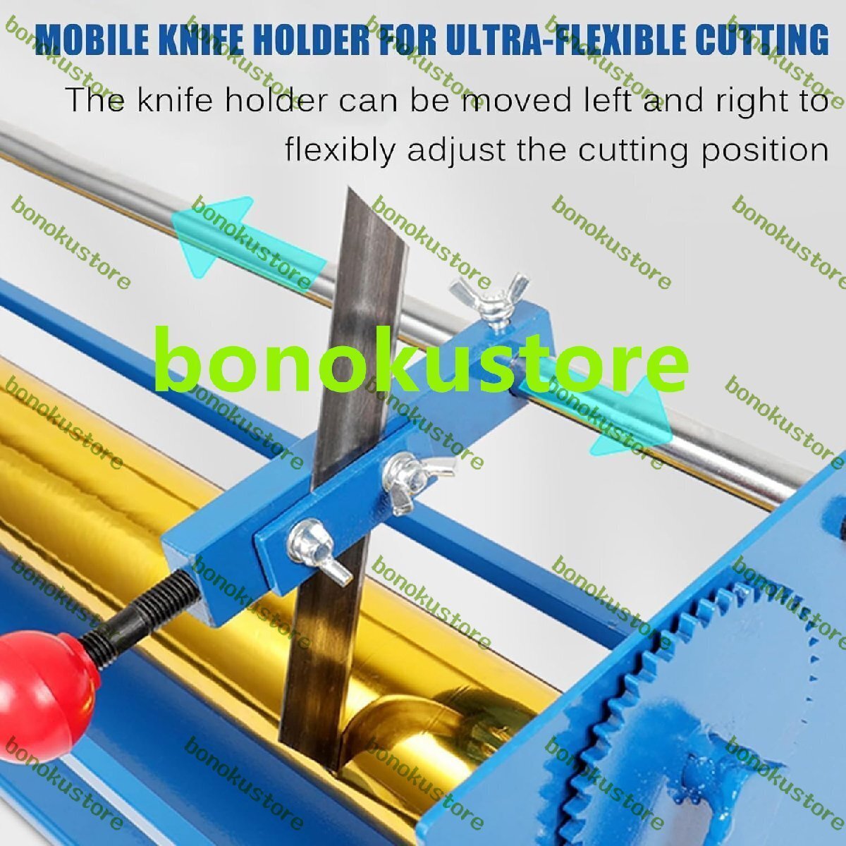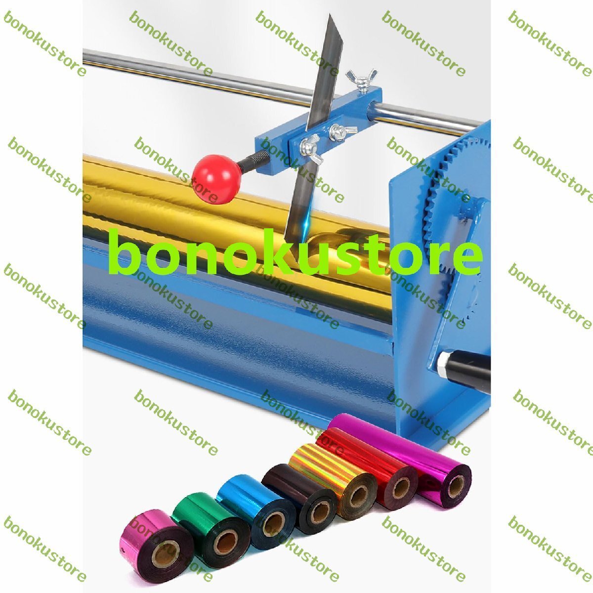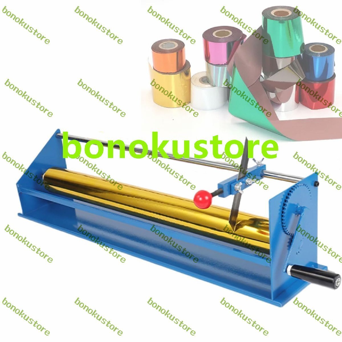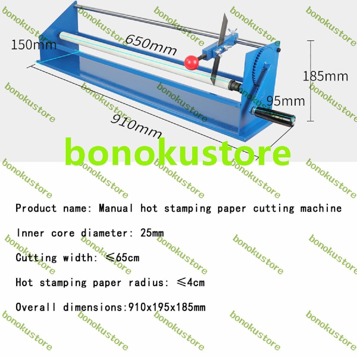 製品名: 手動ホットスタンピング紙切断機 内芯径:25mm 切断幅: ?65cm ホットスタンプ紙の半径: ?4cm (ホットスタンプ紙ロールの長さ120メートル) 全体寸法:910x195x185mm