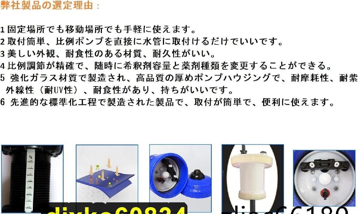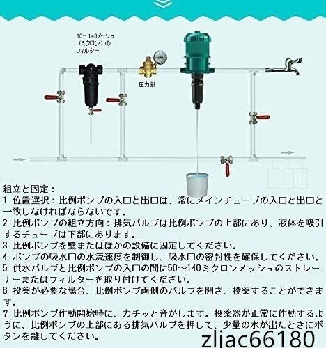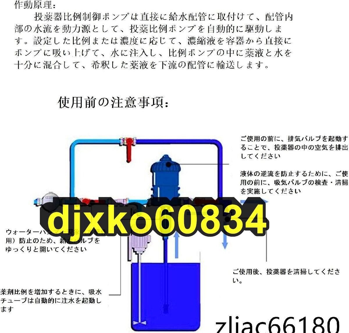1、混合希釈比例範囲:原液0.2-2%,1:50-1:500倍に希釈,32mm外径,25mm内径,流量範囲:10L-2500L/H,作動水圧:0.34-6.2bar。 2、投薬比例ポンプは給水配管に直接に取り付けられ、電源を使わずに、水圧を動力に転化し、人で操作する必要がなくて、自動的に運行できます。希釈器は容器から必要な薬液を直接に吸い取り、希釈器で水と混合し希釈した後、水圧によって排水口から排出します。 3、 固定場所でも移動場所でも手軽に使えます。取付簡単、比例ポンプを直接に水管に取付けるだけでいいです。美しい外観、耐食性のある材質、耐久性がいい。先進的な標準化工程で製造された製品で、取付が簡単で、便利に使えます。 4、比例調節が精確で、随時に希釈剤容量と薬剤種類を変更することができる。本製品は、水圧や水流量を変えないので、家畜や灌漑用水に影響しません。 5、主な応用分野:1、園芸業界で、花卉、果物、野菜の施肥、保存、害虫予防。2.畜産業で、鶏、アヒル、牛、豚などの健康のために、比例に応じて薬を投与します。3.工業界で、水処理、化学工業、金属加工、消防などに使えます。4.特殊溶剤の定比例調製、例えば:脱臭(味抜き)、冷却、潤滑、希釈。5.自動車洗浄、印刷業界、クリニック、酒業界など。
