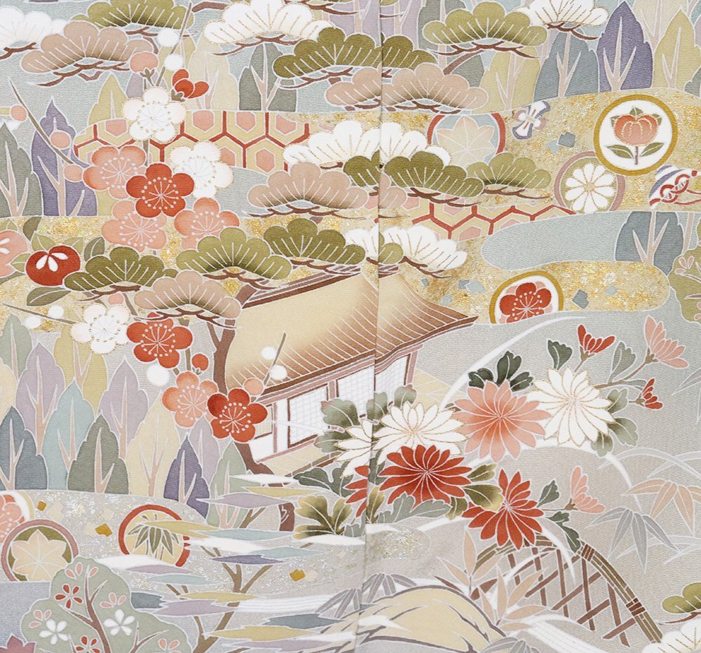 | 色・柄 | 仮絵羽 色留袖 丹後縮緬地 薄緑・青グレー暈し地 茶屋辻・松竹梅 上品な色留袖です。 (写真では上手く色が出ない場合があります。ご了承下さい) |