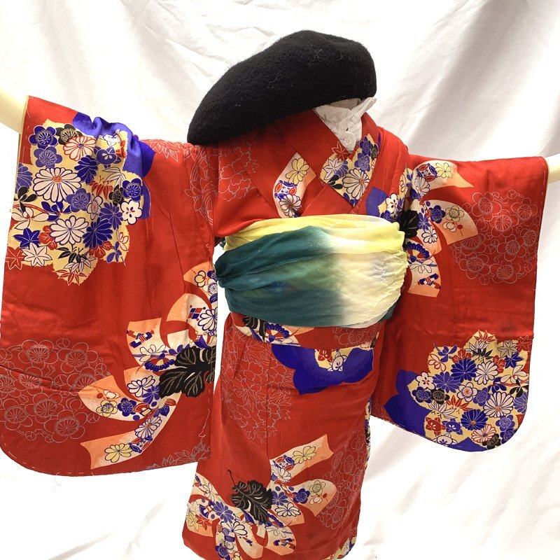 | ■アンティーク キッズ着物 三歳  四歳 女児 着物&兵児帯■ (No.n) こちらの商品はお着物とおまけでお付けしております兵児帯のセットです(中に着ているブラウスやベレー帽、ブーツなどの小物はセットに含まれません)。人気のアンティーク着物です。冴えた赤地に束ね熨斗や花丸文のコントラストが綺麗なお着物セットです。 お正月やお節句、ご兄弟の七五三の付き添いコーデなどにいかがでしょうか? (着物)八掛にアクがございますが、お着付けをすると隠れる部分です。左衽、左前身頃、左外袖にある様なシミが他にもございますが、遠目で見るとあまり目立ちません。保管シワがございますが、スチームアイロンでシワは伸びます。気になりましたら、スチームをあててください。 (長襦袢)こちらには長襦袢が付属いたしません。代わりにお子様の負担が少なく、便利な子ども用楽々衿をお勧めします。#ag楽々衿 (帯)おまけで兵児帯をお付けします。多少のシミがございますが、お着付け次第で隠れる部分です。 【素材】(着物)正絹 【色】深い赤 *モニターによって色味は実際と異なる場合がございます。 【サイズ】(着物) 裄:45cm、肩上げ:.3.2cm、袖幅:26cm、袖丈:43cm、丈(肩から):89cm、腰上げ:10.6cm、前幅:18.7cm、後幅:24.7cm (*素人採寸のため、多少の誤差はご容赦ください。 アンティーク着物で古い物ですので、それなりのシミや汚れ、ほつれなどダメージ等あるかと思います。現在出回っているアンティーク着物はシミやアクなどのダメージや手直しなど難がある事の方が多いです。多少の目立たないシミやアクに関しては記載をしておりませんので、ご了承ください。新品同様の綺麗さをご希望の方、少しのシミやアク、ほつれなどアンティークに御理解頂けない方のご購入はお控えいただきますよう、お願いします。  |   |