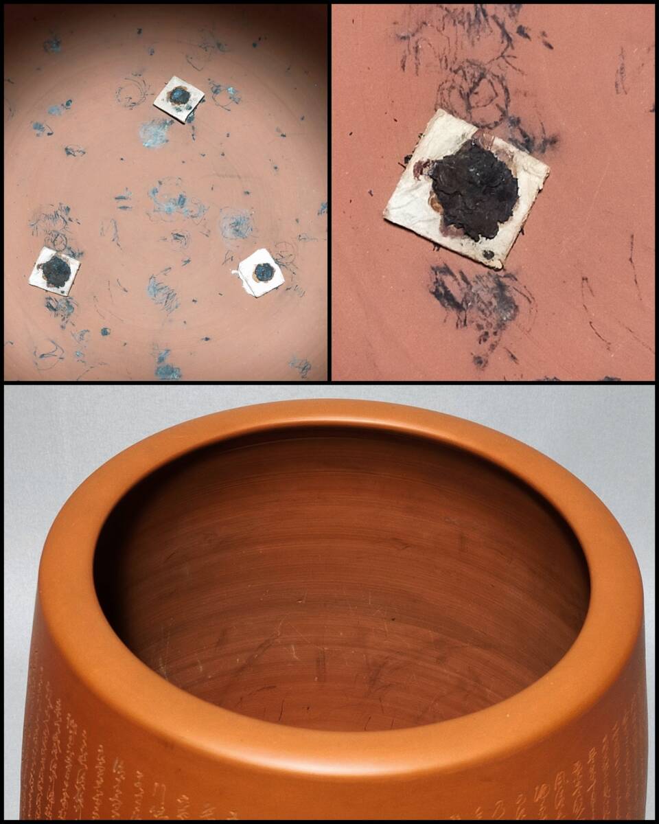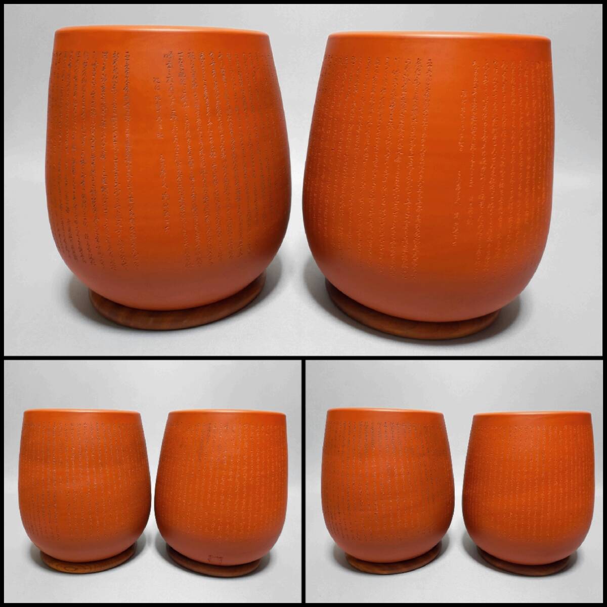常滑焼 火鉢 名工 山田陶山 造 朱泥 細密細字彫刻 瓶掛 手焙 一対 高27cm 木台付 木箱