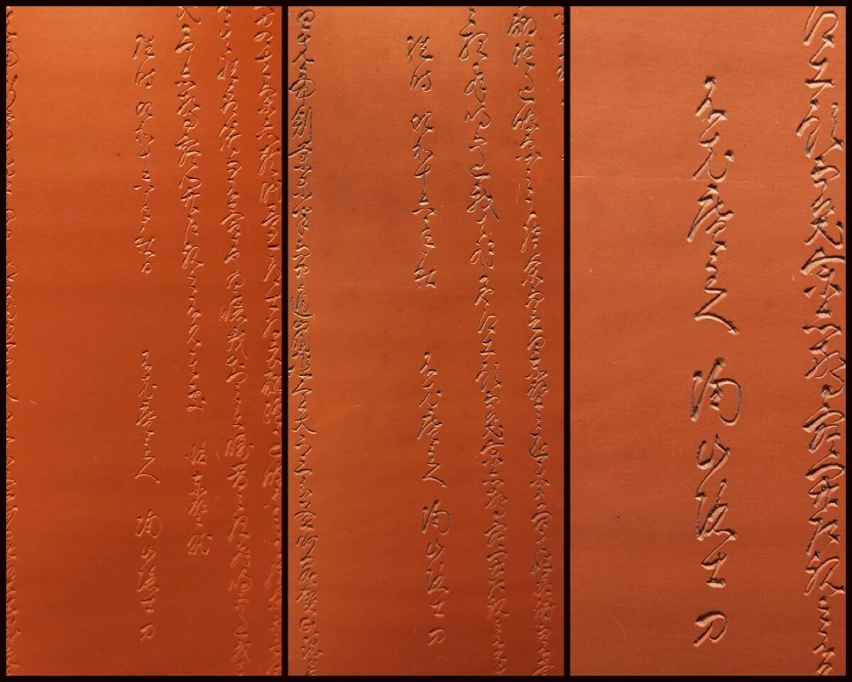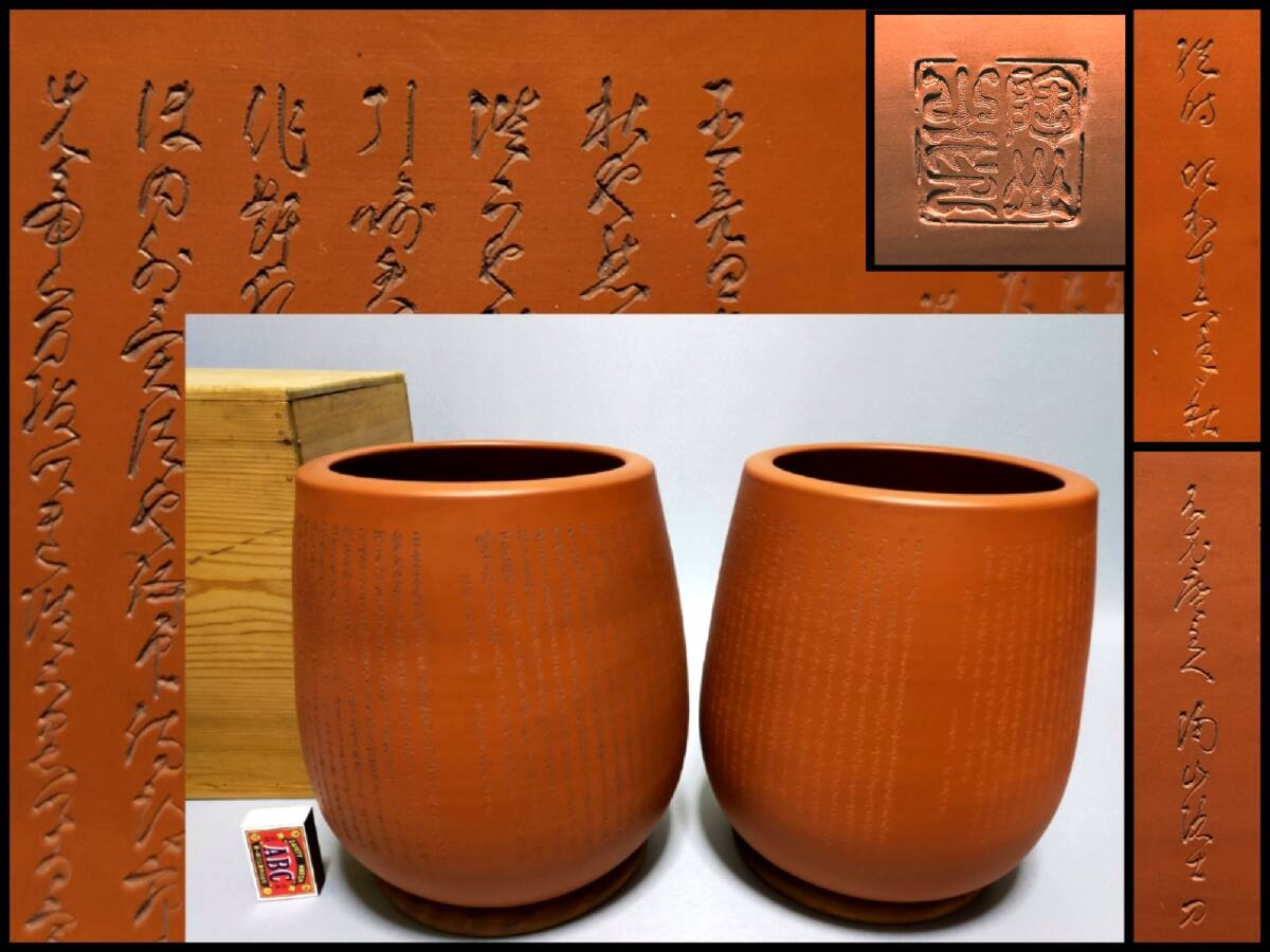 FK02 常滑焼 火鉢 名工 山田陶山 造 朱泥 細密細字彫刻 瓶掛 手焙 一対 高27cm 木台付 木箱