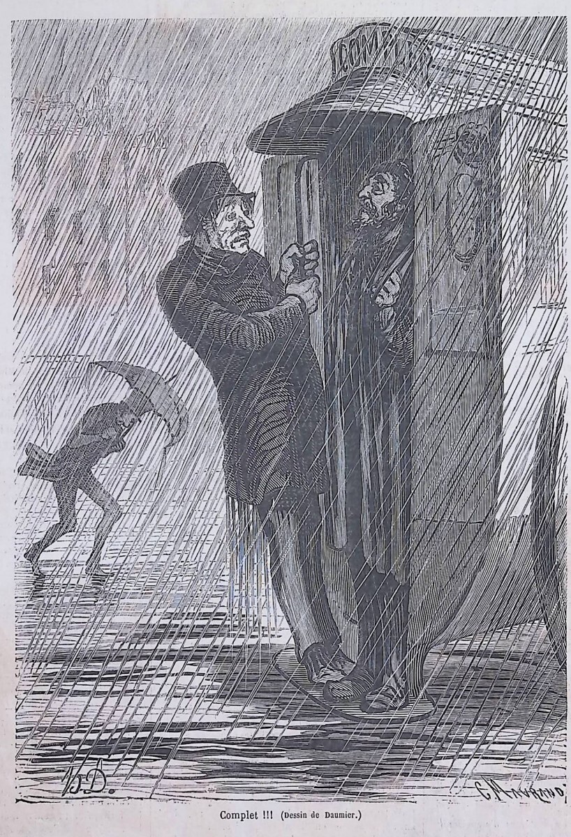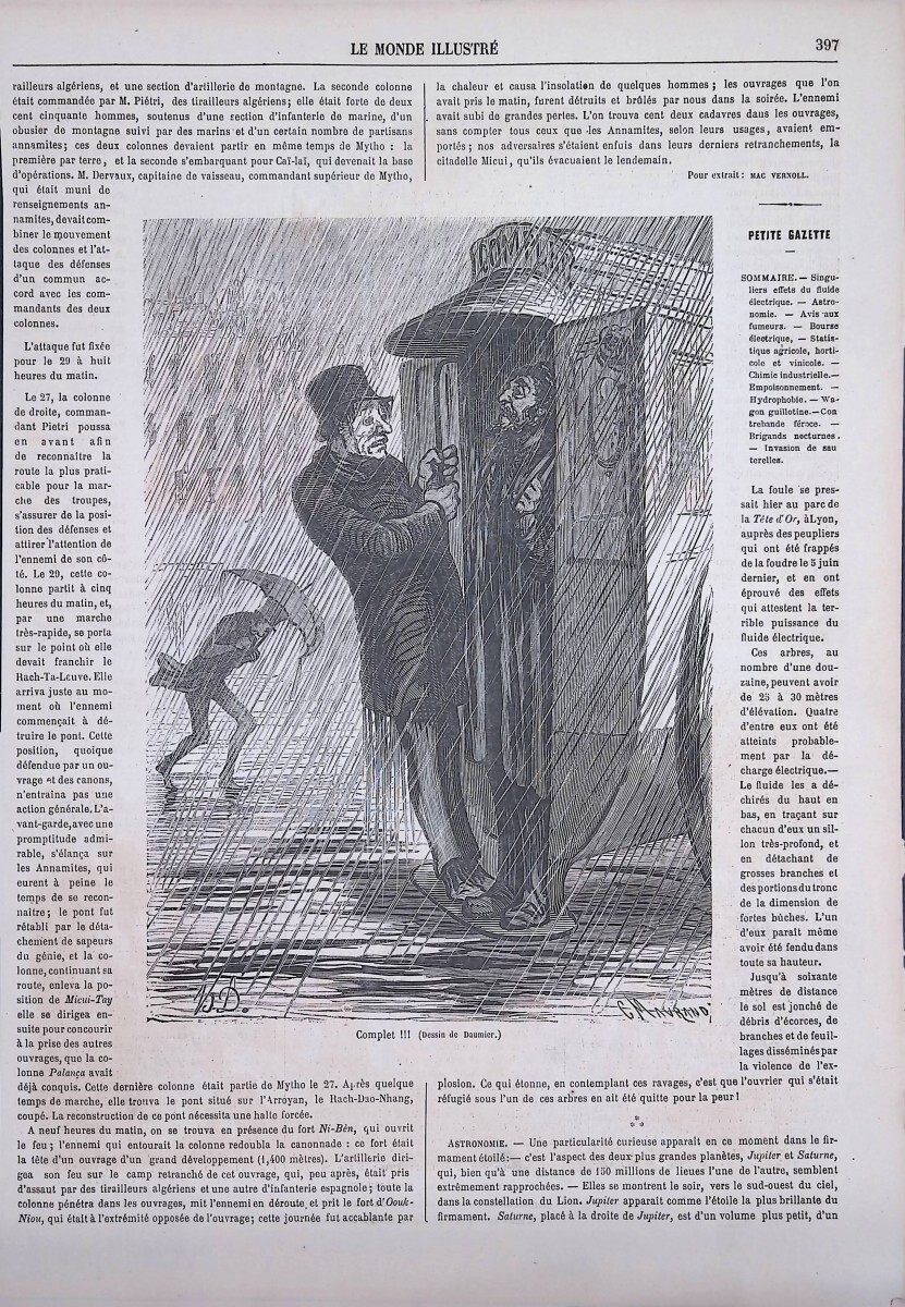 Honore Daumier の作品は、1960年代にパリで刊行される新聞に掲載されるようになります。これは、当時の新聞の一葉です。オリジナルの木口木版画です。 新聞紙のサイズは26cmx36.7cmです。その半分くらいの部分がドーミエの版画です。少し古色が出ていますが、状態は良いと思います。版上にサインがあります。ドーミエの版画のうち、新聞に掲載されたものは、殆ど残っていません。非常に珍しいものです。