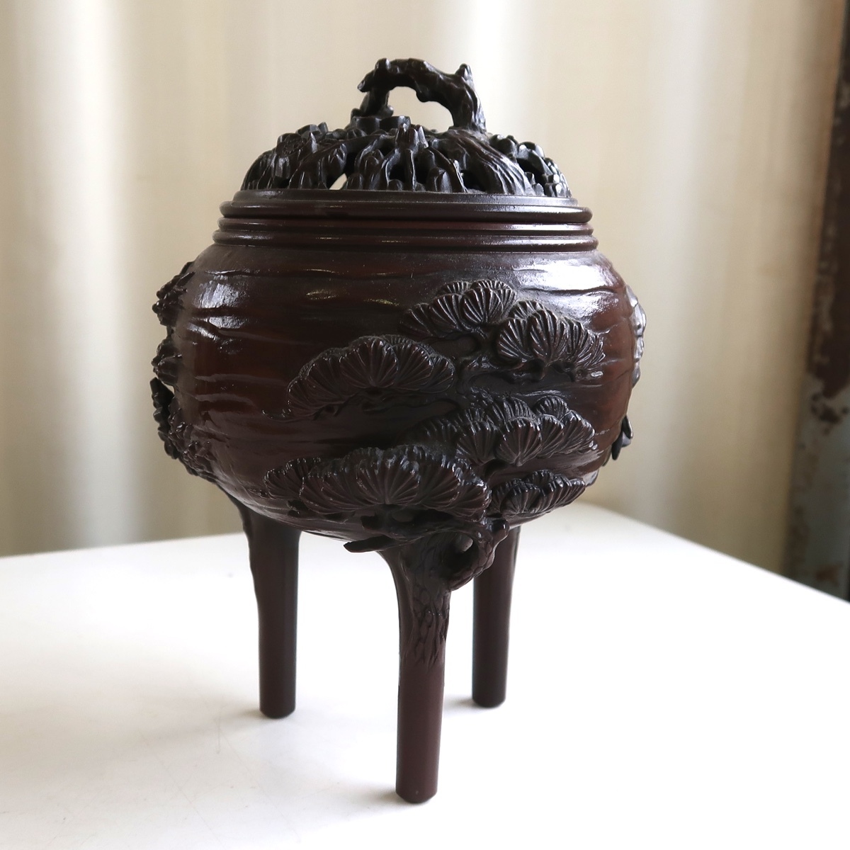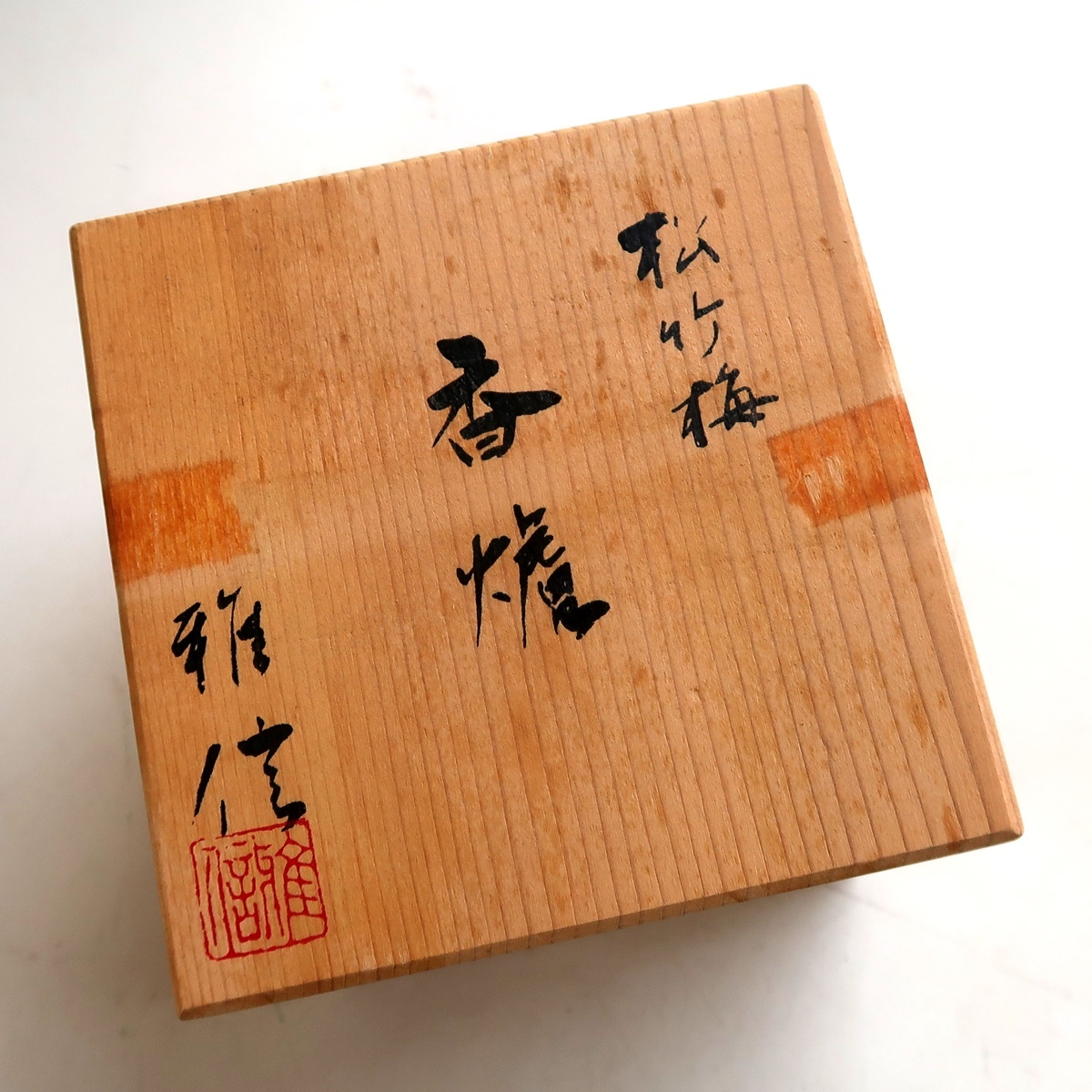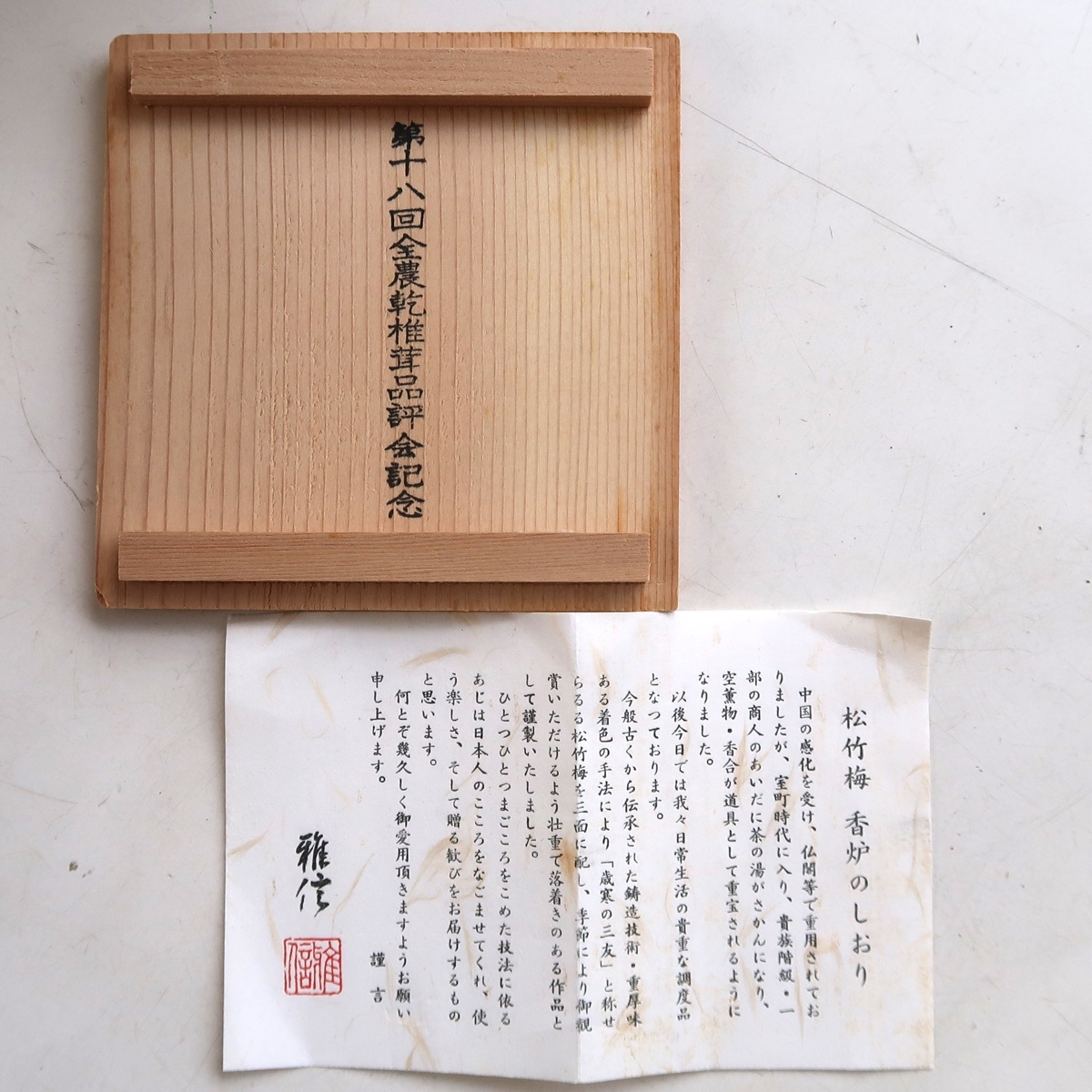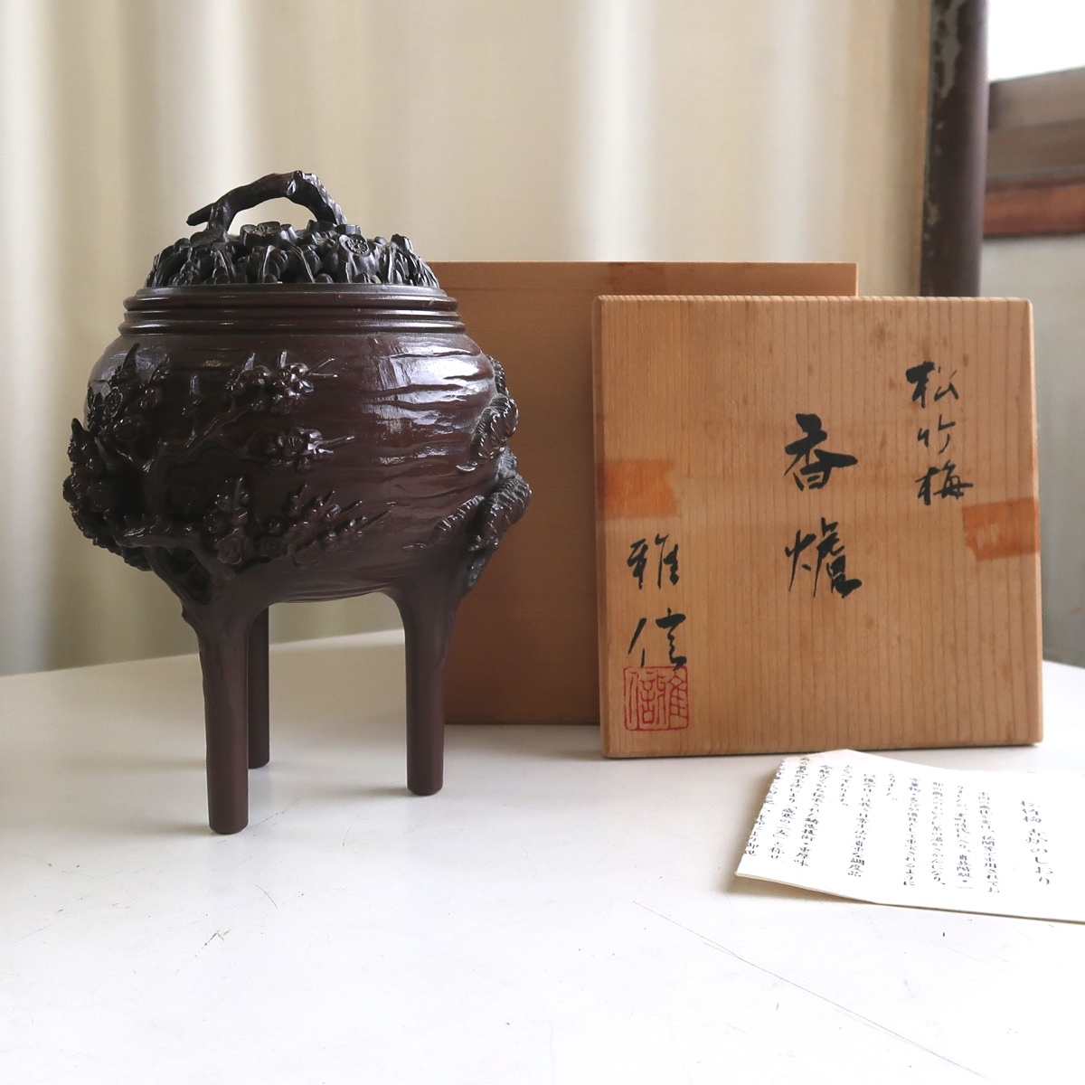 鋳物 金属工芸 雅信 松竹梅 盛上地紋 三足 香炉 鋳銅 未使用 長期保管品 共箱です。