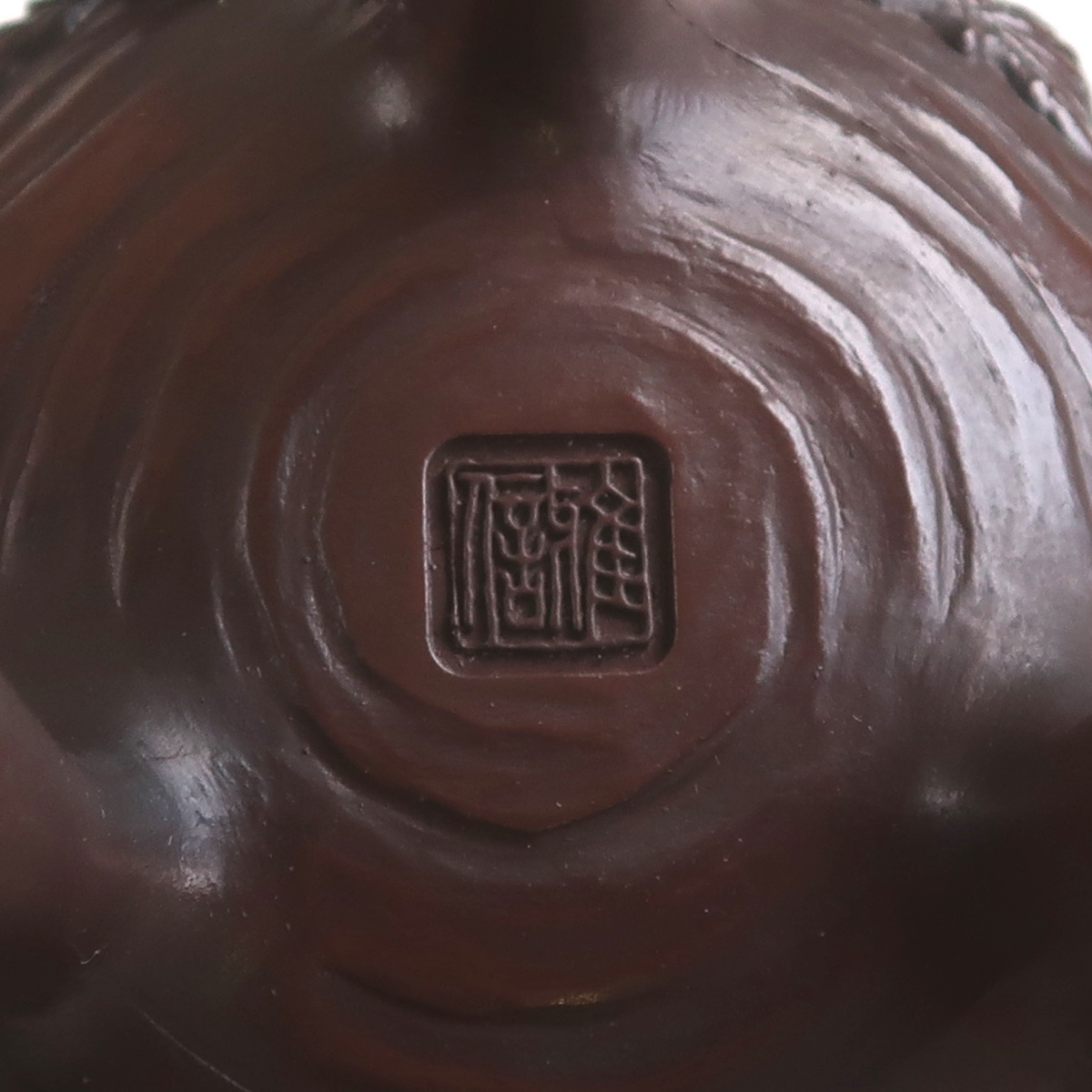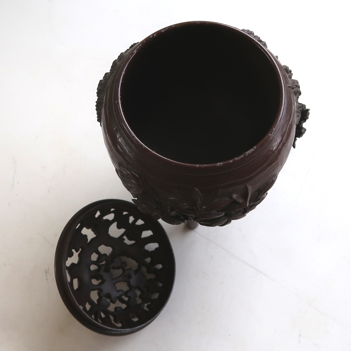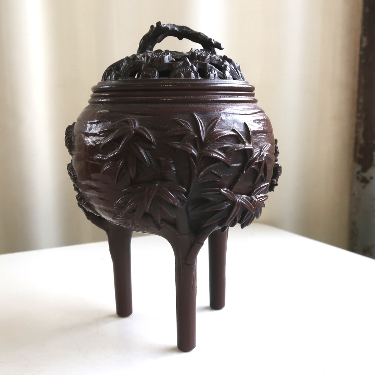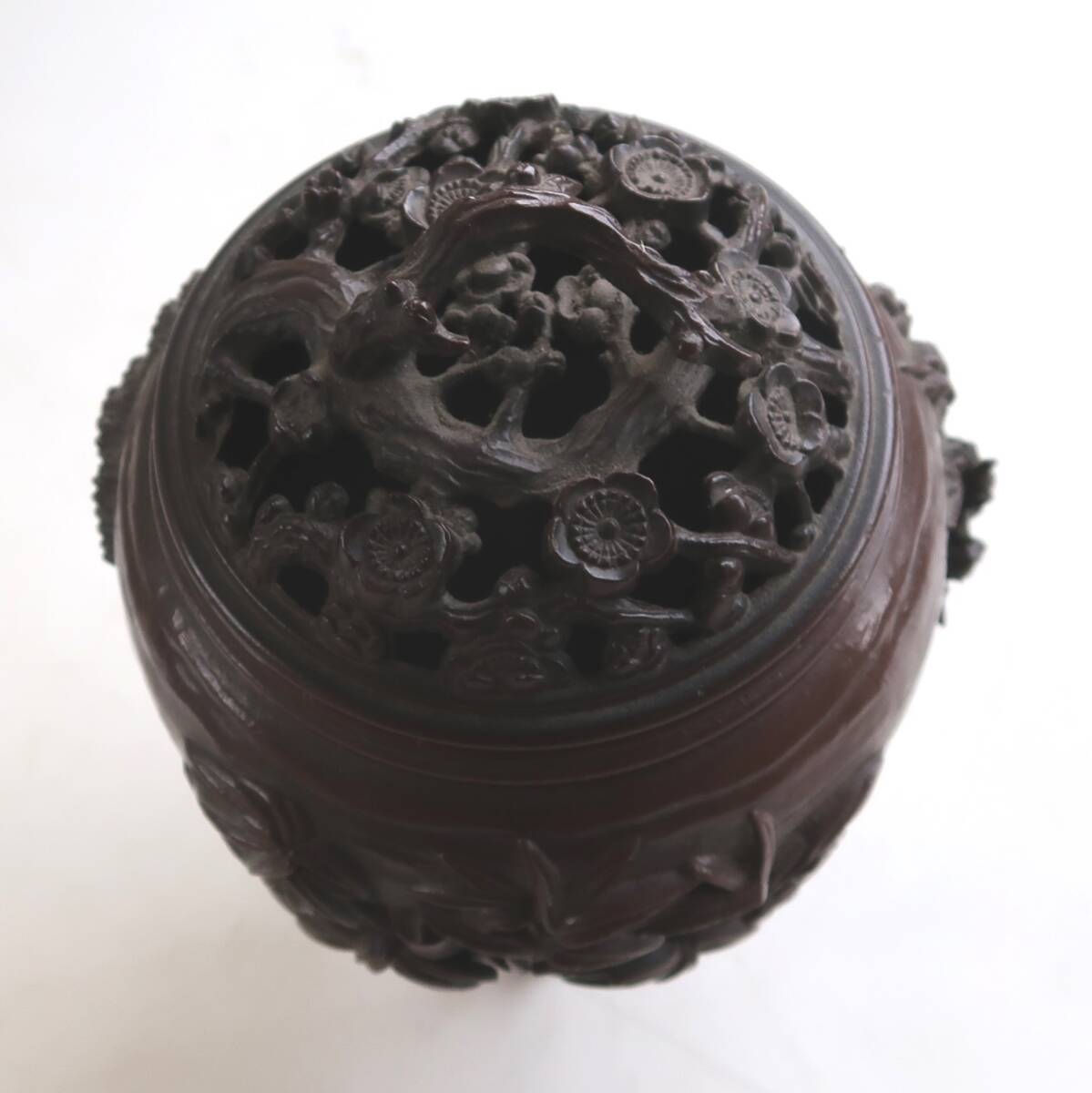 鋳物 金属工芸 雅信 松竹梅 盛上地紋 三足 香炉 鋳銅 未使用 長期保管品 共箱です。