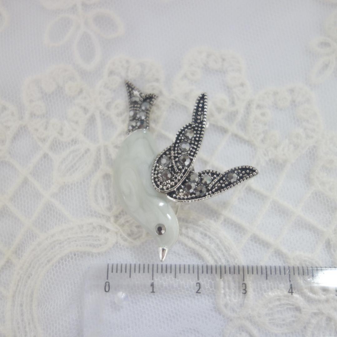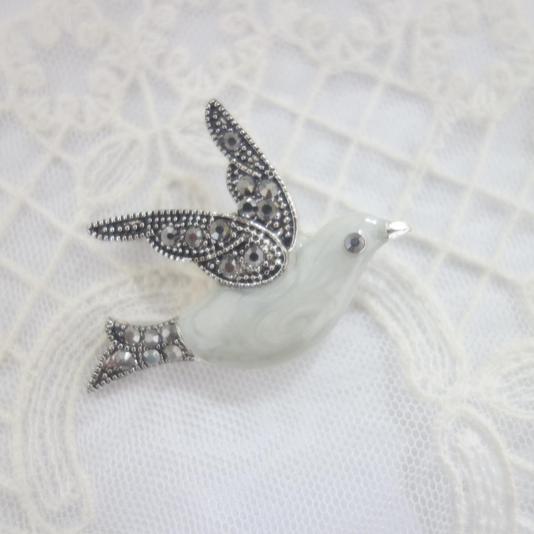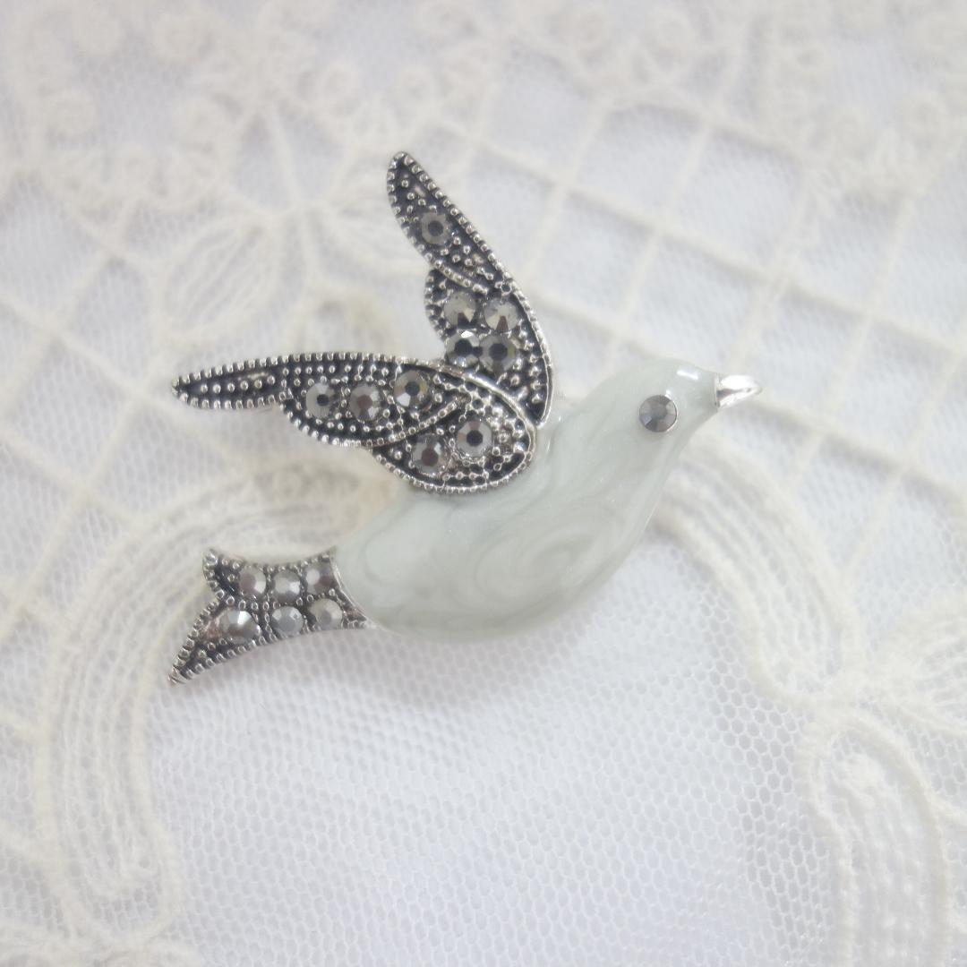 空を飛ぶハトの可愛いブローチです♪ 羽とお目目はマーカサイトみたいな煌めきが綺麗なブラックのラインストーンが飾られてシックな可愛さです。 ハトは平和のシンボルと言われています♪ ちょっとしたお出かけにも付けやすいサイズ感で 持っていると、コーディネートの幅が広がりそうですね♪