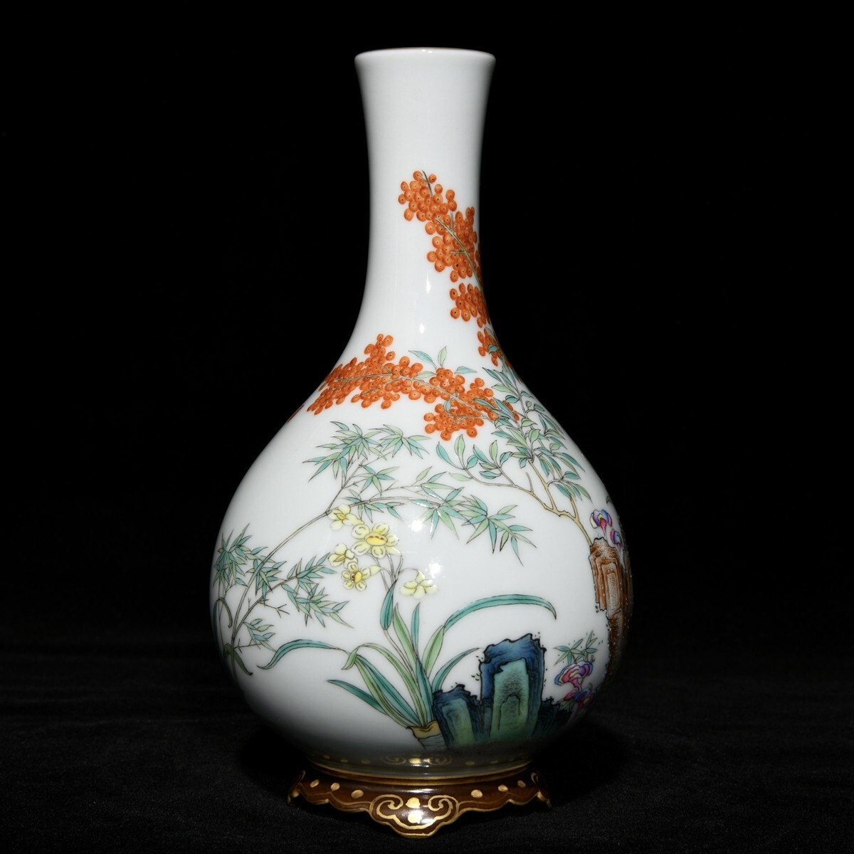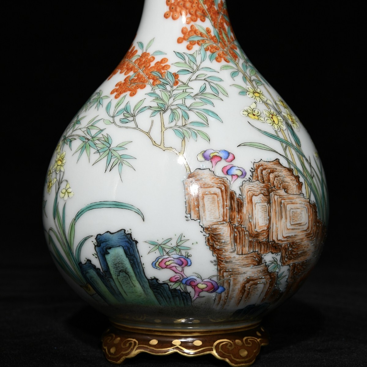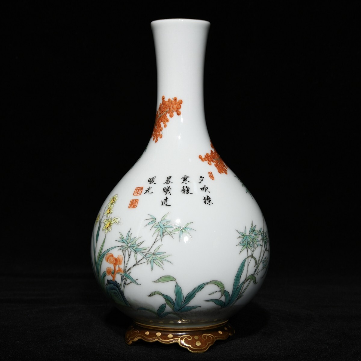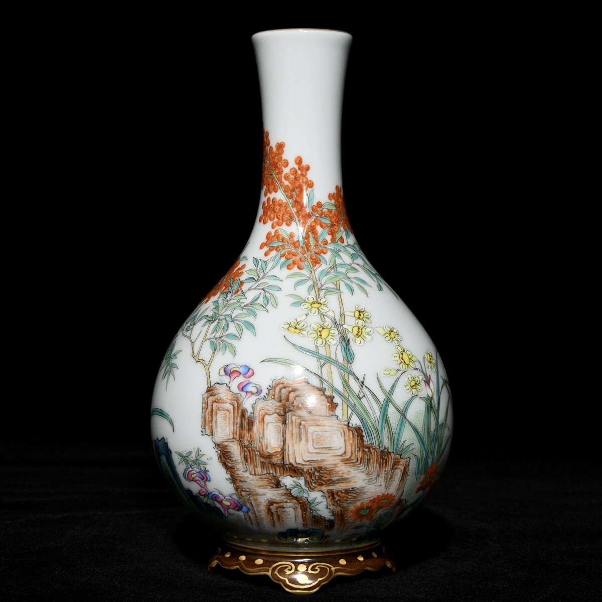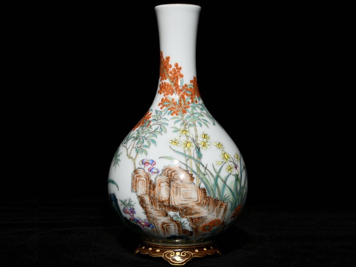 「清 乾隆年製 陶磁器 粉彩梅蘭竹菊紋連座膽瓶」染付 置物 擺件 古賞物 中国古美術 旧蔵出