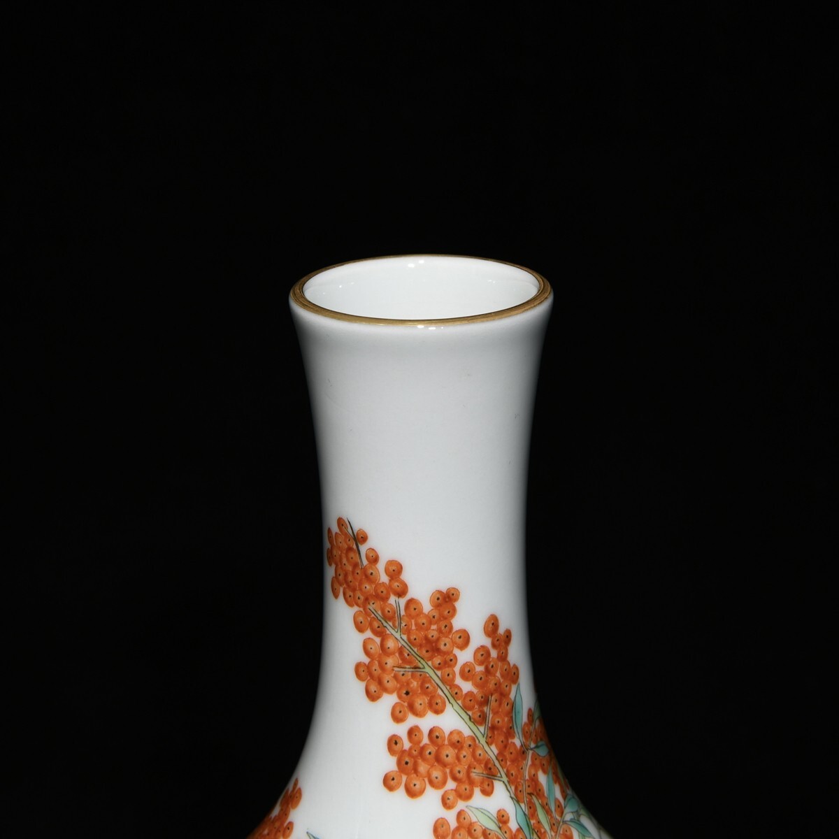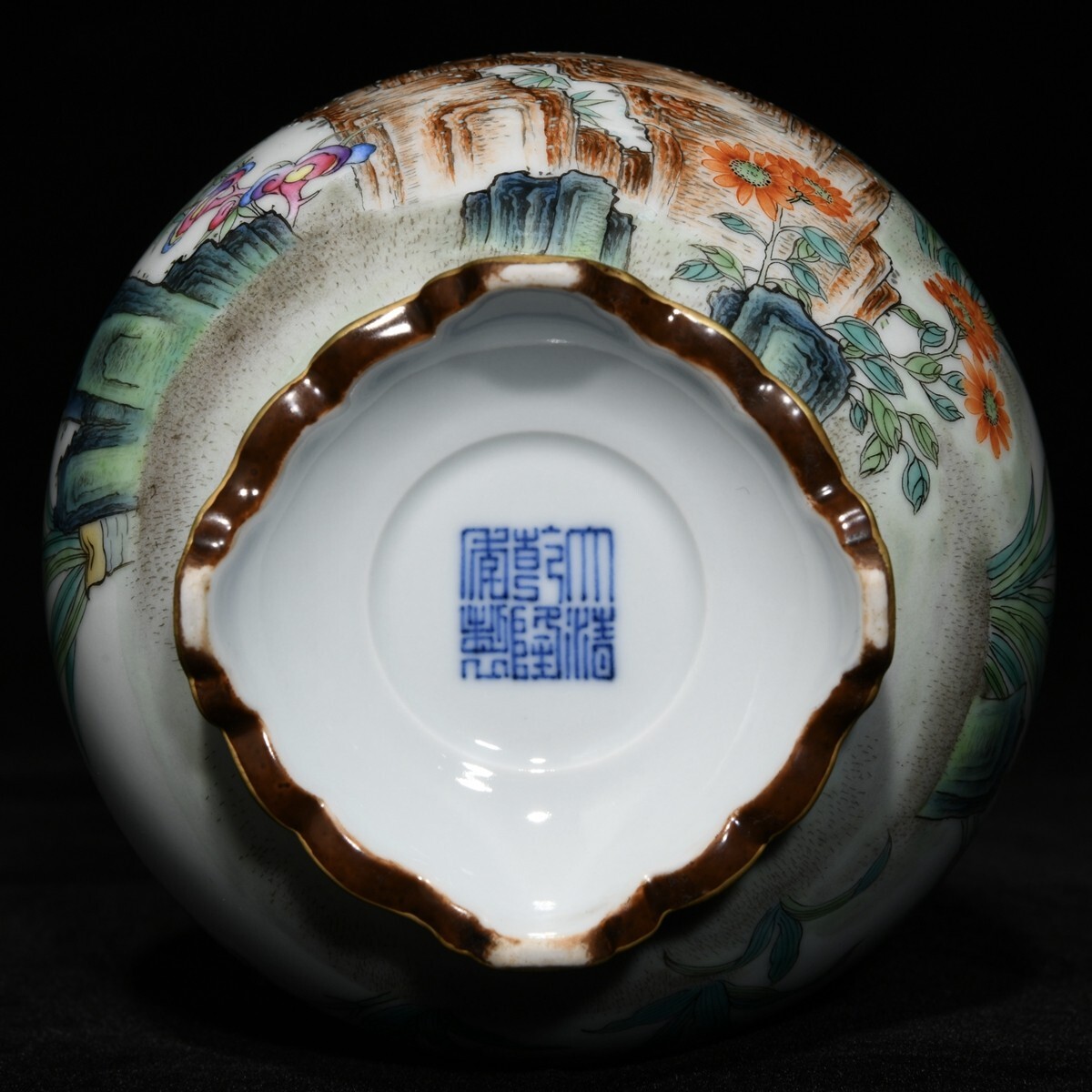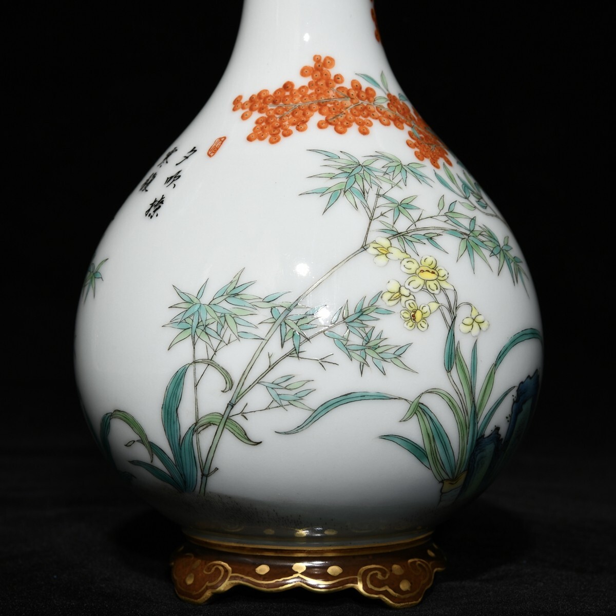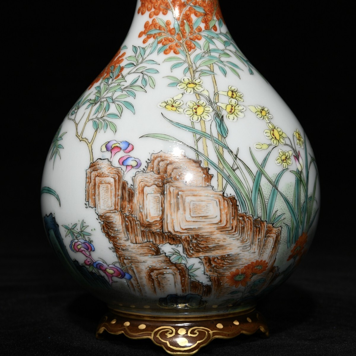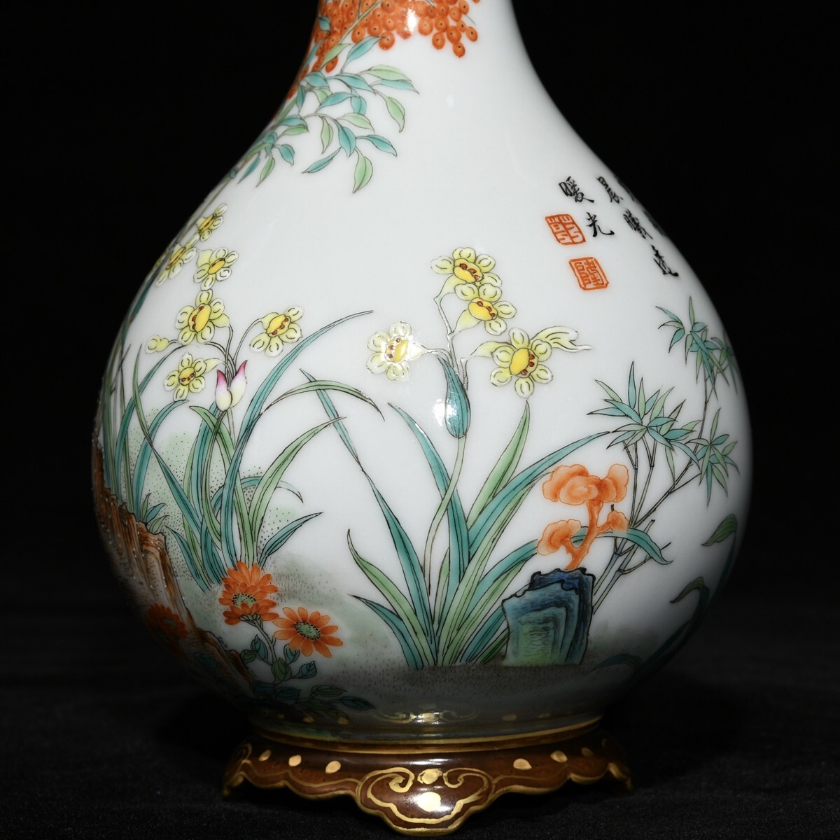 「清 乾隆年製 陶磁器 粉彩梅蘭竹菊紋連座膽瓶」染付 置物 擺件 古賞物 中国古美術 旧蔵出