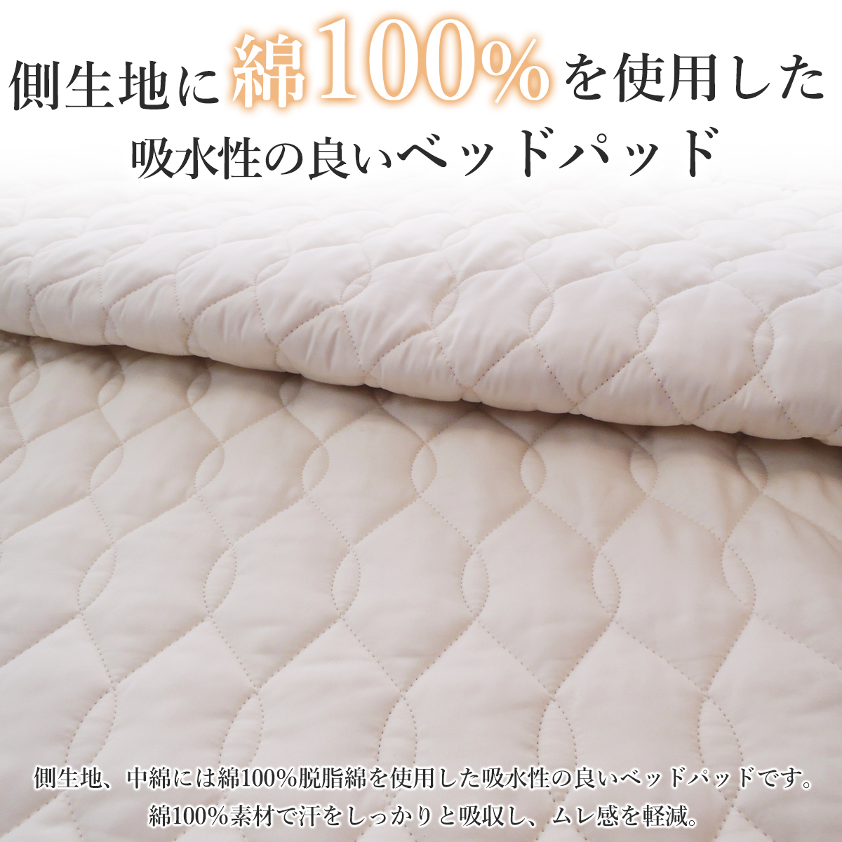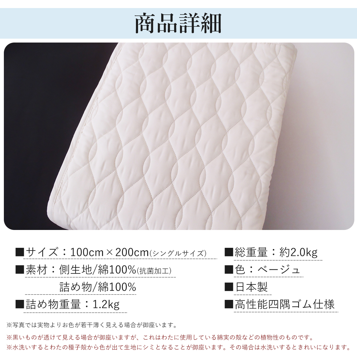 西川 洗える ベッドパッドシングル ウォッシャブル シングルサイズベット用 日本製 綿100% 脱脂綿 コットン 四隅ゴム付 100×200cm